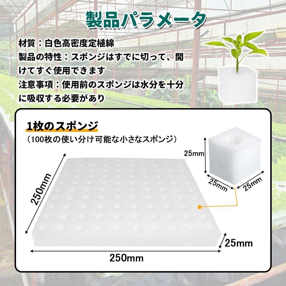 【製品規格】1枚のスポンジ(100枚の使い分け可能な小さなスポンジ)を含み、需要に応じて取りやすく、各スポンジは単独で使用でき、それらは各種植物の栽培、特に水耕、野菜栽培などのシーンに適しており、家庭園芸に非常に便利である。