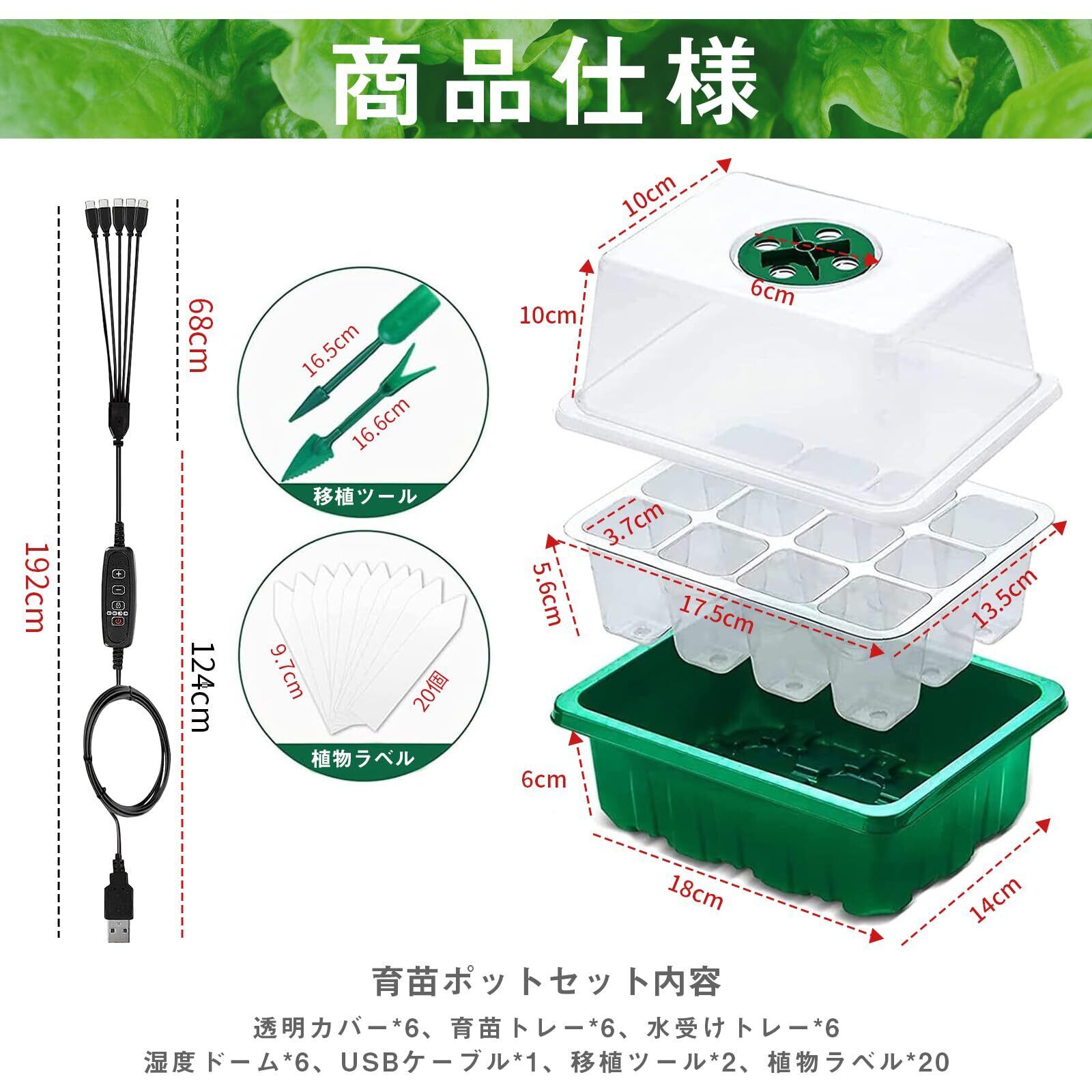 【新世代育苗ポット】セット内容:透明カバー*6、育苗トレー*6、水受けトレー*6、湿度ドーム*6、usbケーブル*1、移植ツール*2、植物ラベル*20。本体サイズ(1個):約18.5*14.5*16cmで、中には12穴があります。12穴で同時に12本の苗を育成できます。【野菜・草花・苗木の育苗に】ジャガイモ、トマト、ピーマン、ナス、花、ハーブ、その他の植物に最適です。家、農場、中庭、バルコニーに最適です。果物、野菜、花を植えるために使用できます。また、イチゴ、ブドウ、多肉植物、苗木などの栽培に適しています。