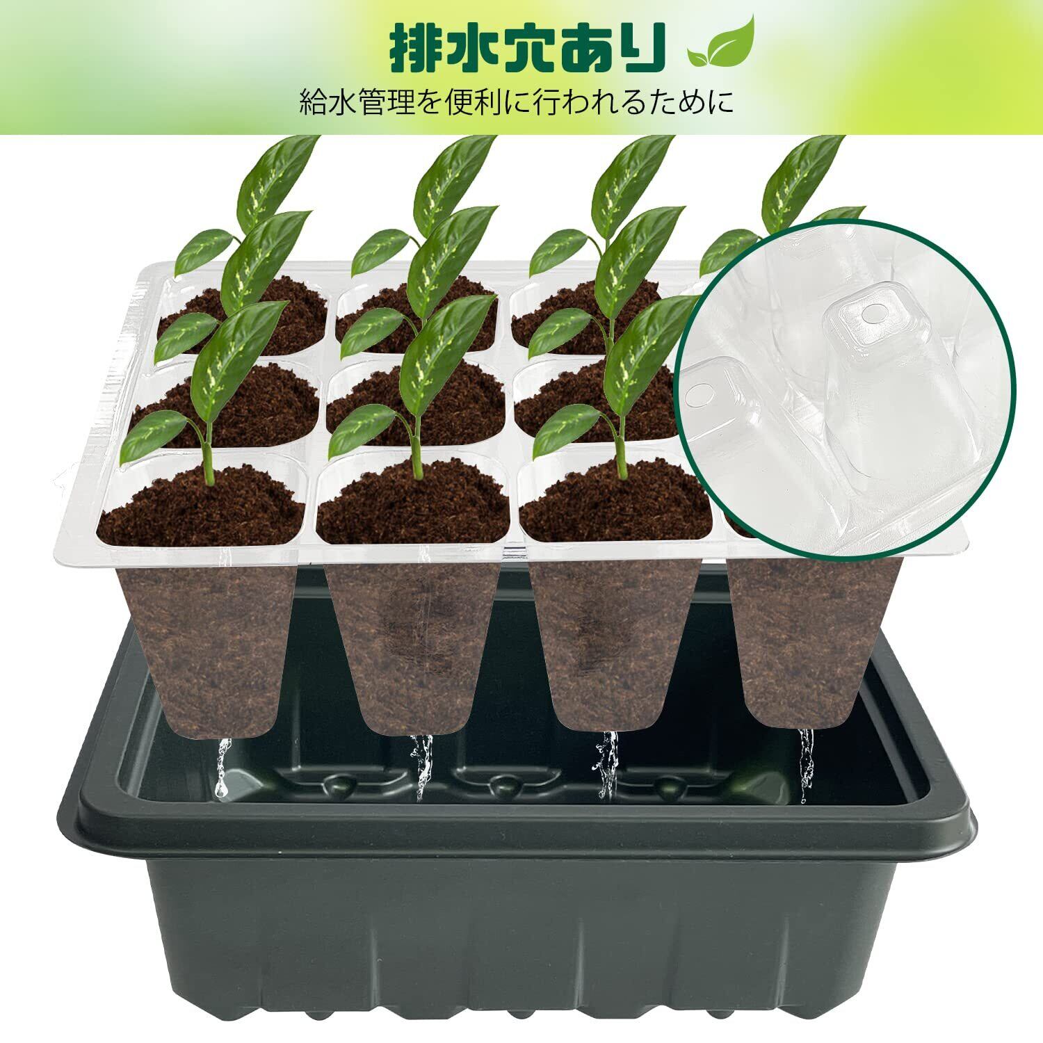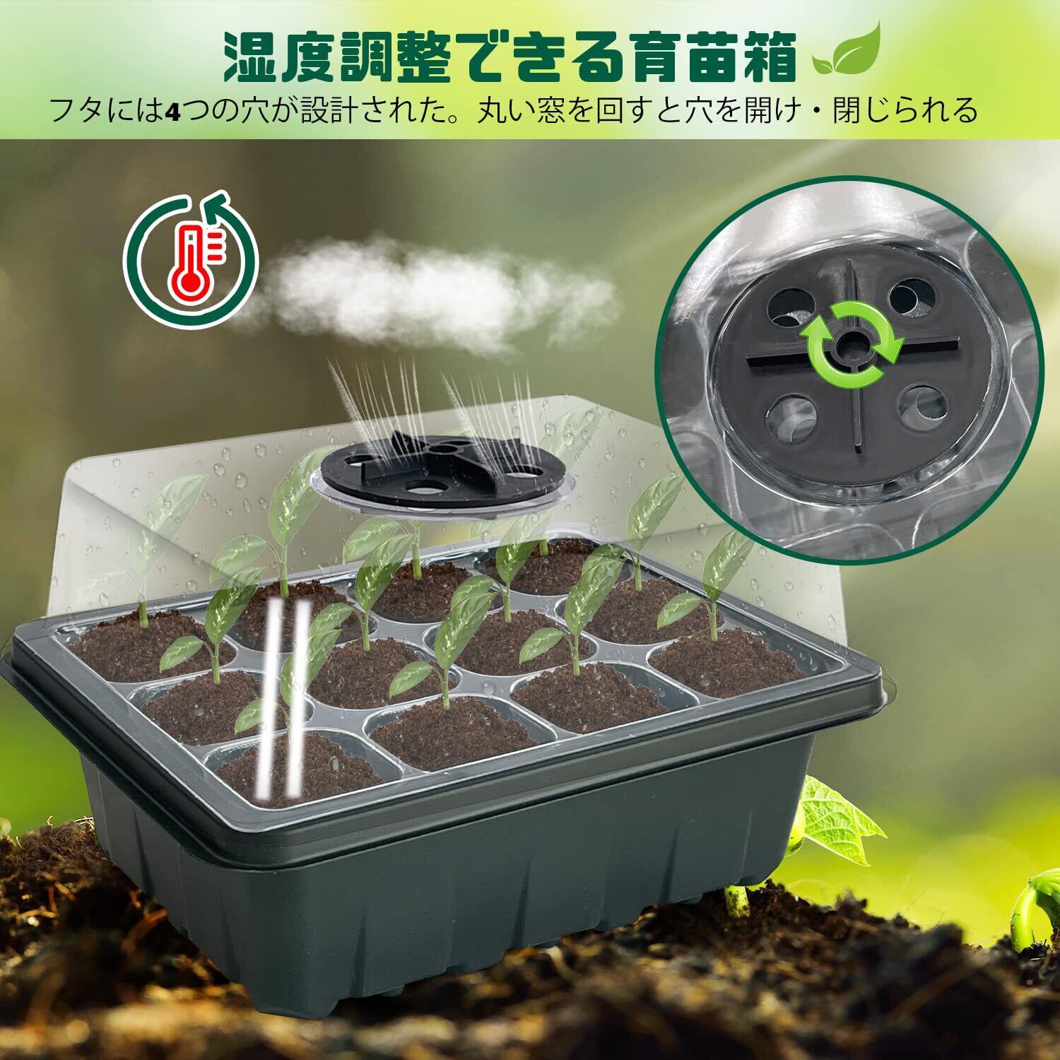 【排水穴・湿度調整】フタには湿度調整のため、4つの穴が設計されました。丸い窓を回すと穴を開け・閉じられます。トレーの底側に排水穴に設置されたため、根が水分を吸収しすぎるのを防止できます。受け皿が用意して、土が乾きにくい、給水管理を便利に行われます。移植ツールが付属され、製品到着後すぐに使えます。