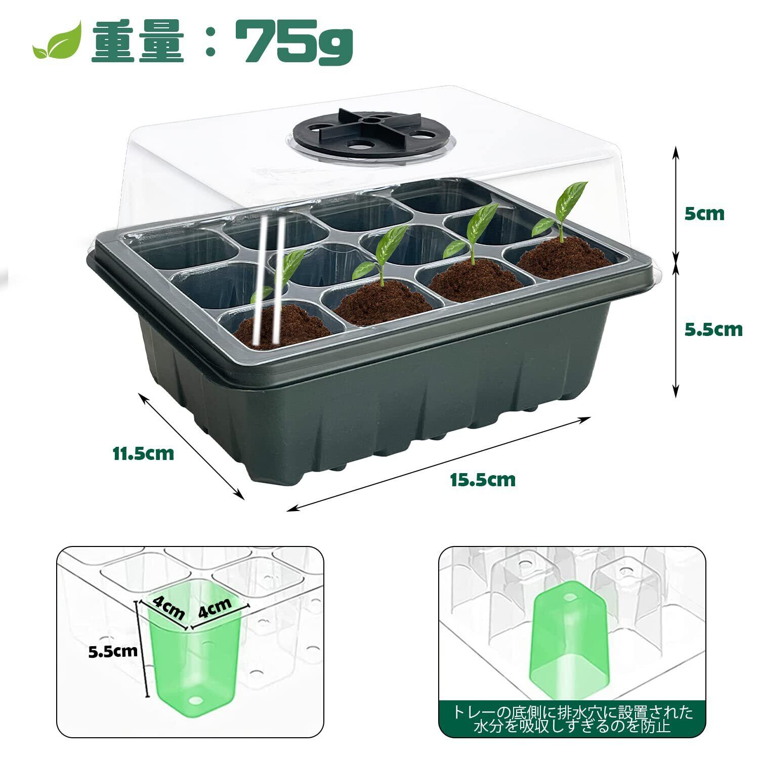 【製品仕様】素材:プラスチック+PET ポットサイズ(約):19*15*6cm 穴サイズ:*4*5.5cm パケージ内容:育苗ポット(12穴)*5、移植ツール*2、植物ラベル*10 カラー:ダークグリーン