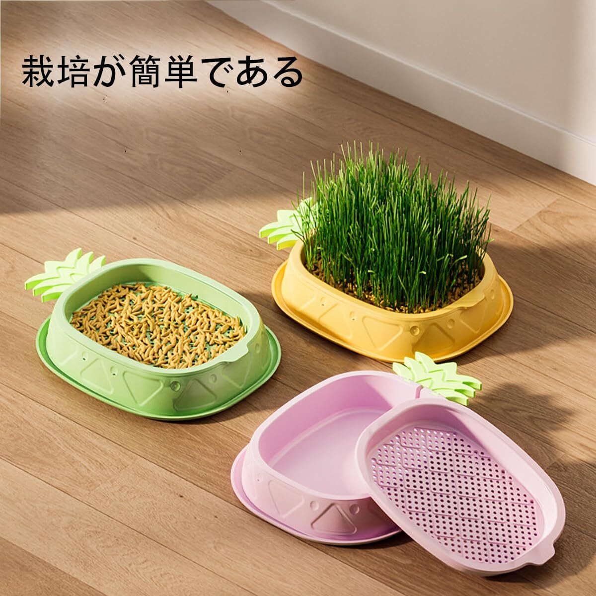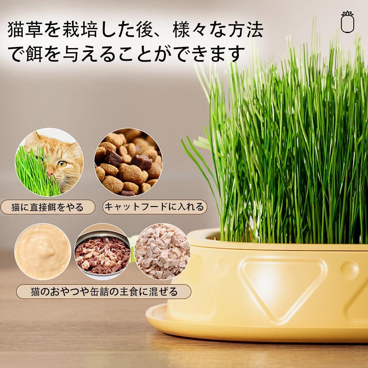 【栽培しやすい】:種子を水に6〜8時間浸す。メッシュトレイに種を均等に散らします。水が出水口から溢れるまでシャーシに水を注入します。注意:猫草が発芽した後、1-2日おきに水をし、4-7日だけで、成熟した猫草を収穫することができます。