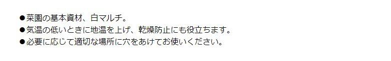 露地栽培の必需品、低温期に地温を上げる効果のある透明(白)マルチの広幅タイプ。センターライン入りで設置作業時に便利です。畝を立て、マルチをかぶせてから周囲を土に埋めて使用します。穴は開いていません。栽培する作物に合わせ、市販のマルチカッターなどで穴をあけて播種・定植してください。
