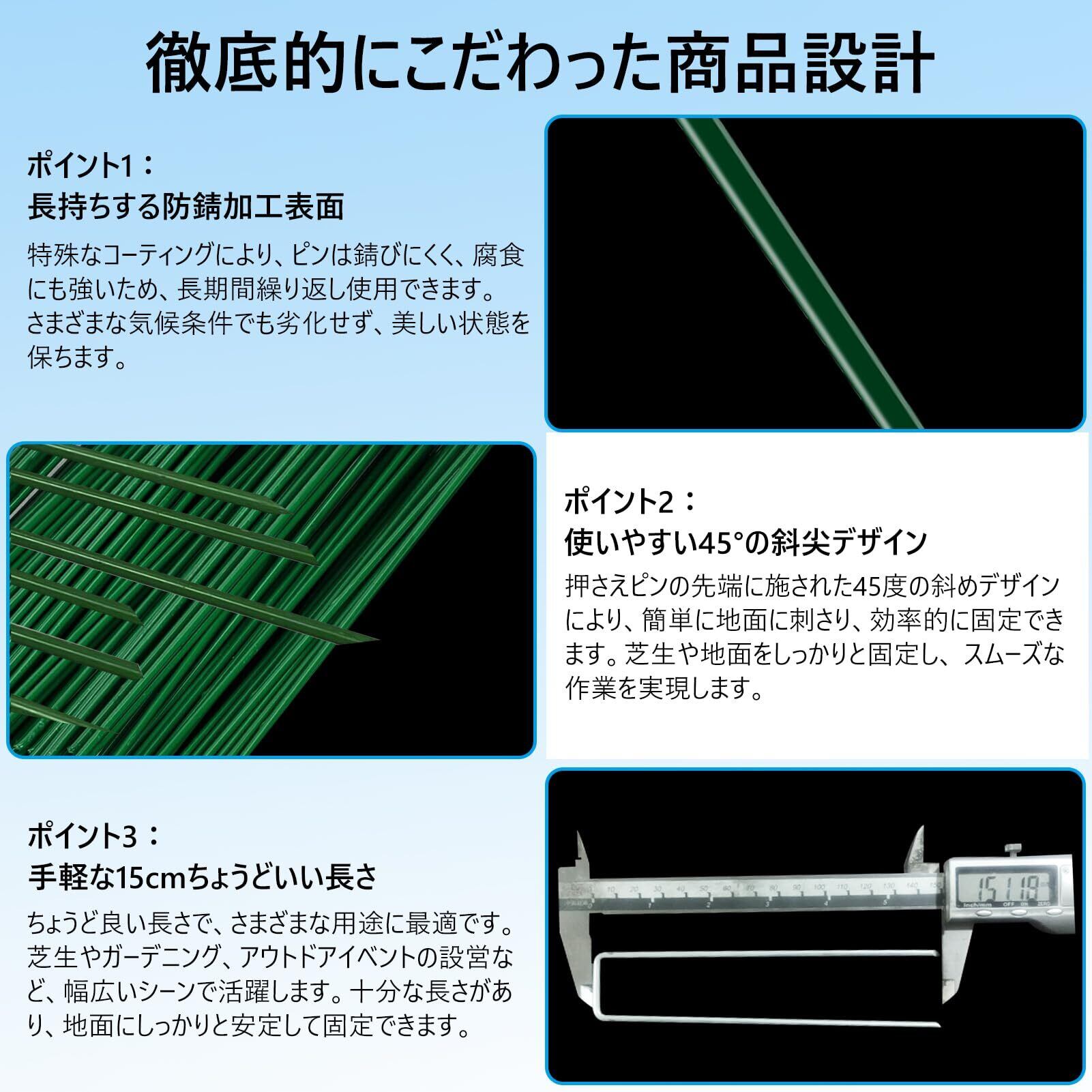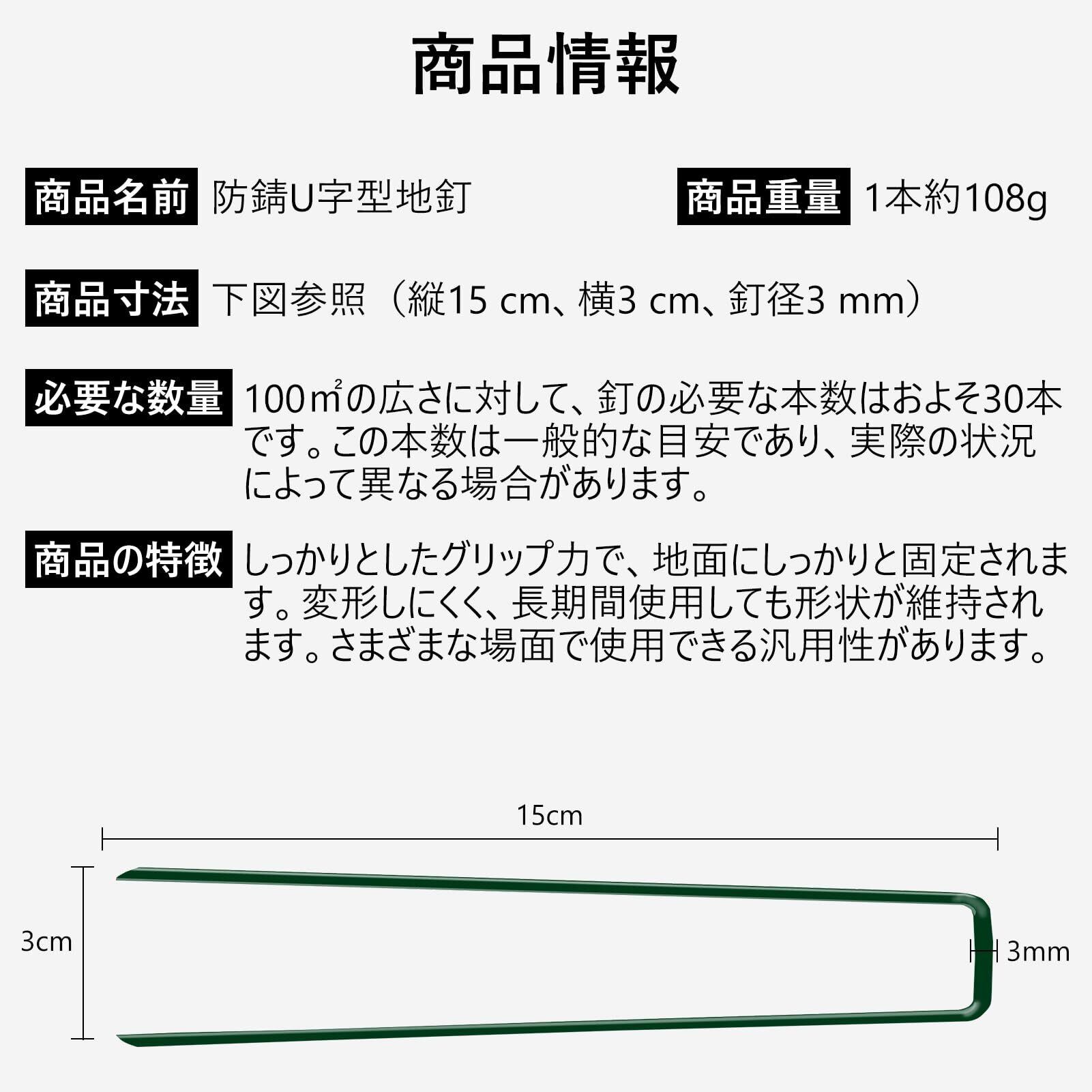 コンパクト&高機能設計:15cmのピンは地面に深く刺さり、人工芝や防草シート、防虫ネットなどの各種シートをしっかり固定。幅3cmのU字型で固定面積が広く、強風でもズレにくい安定感があります。収納や持ち運びも便利で、園芸からキャンプまで幅広いシーンで活躍します。