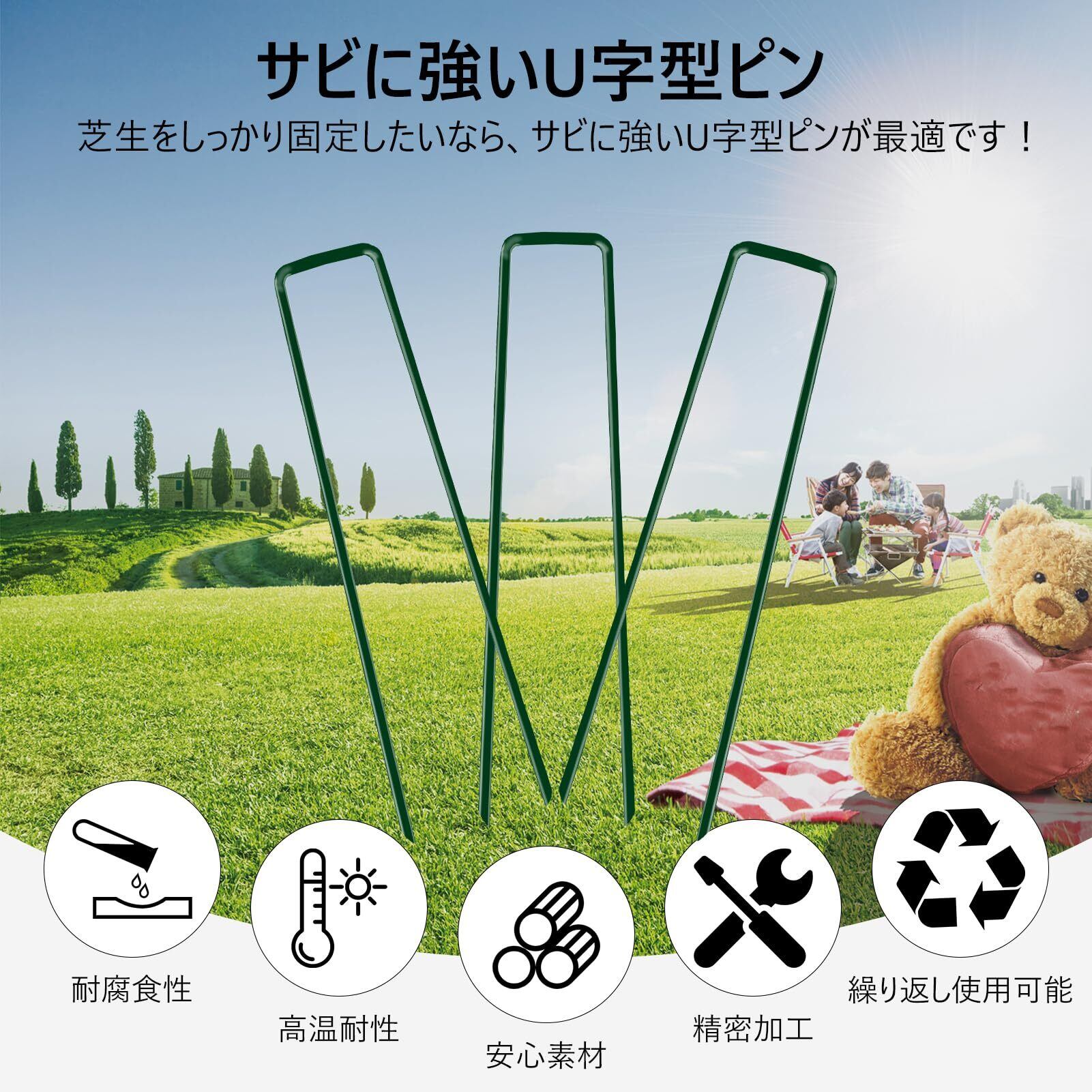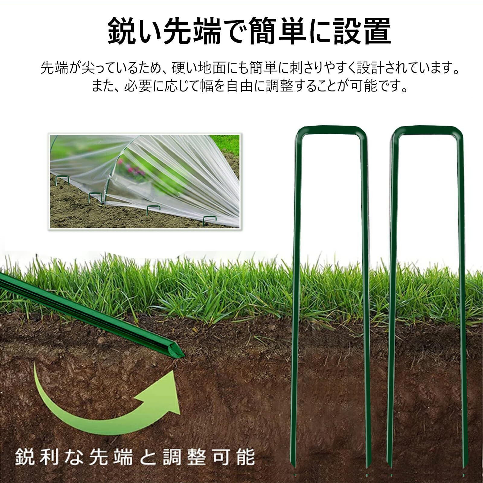 幅広い使用シーンに対応:U字型ピンは人工芝や防草シート、農業用マルチ、防虫ネットの固定に適しています。さらに、キャンプでのテント固定ピンとしてもおすすめで、様々な園芸・農業・アウトドア用品を頑丈に支えます。
