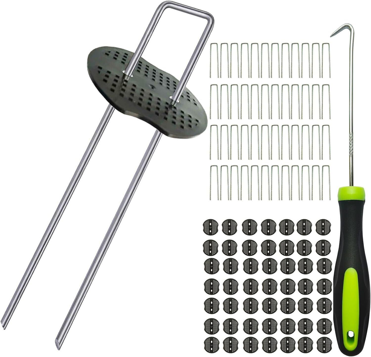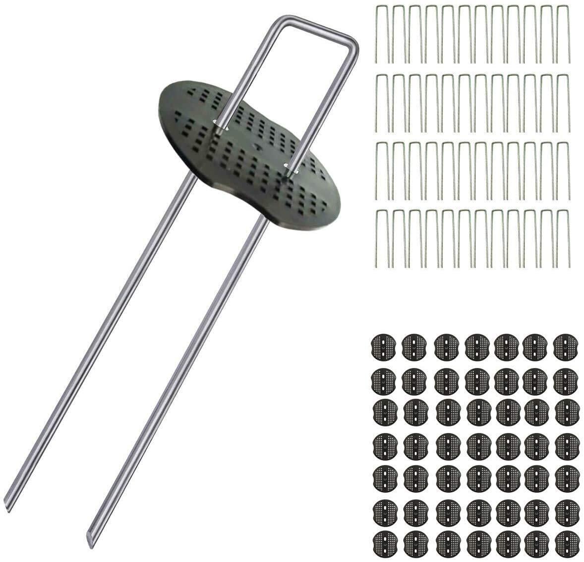 <br>【製品仕様】Uピン杭は亜鉛メッキ鉄材質を採用して、耐摩耗性、耐熱性、耐久性があり、湿度高いや高温環境にも対応できます。サイズは長さ20cm×幅4cm×φ4mmです、重量:31g 梱包内容:50本U字型ピン+50本押さえ板セット(総重量2.1kg)。注意:人工芝の釘はサビることで太くなりより強固に固定されます。