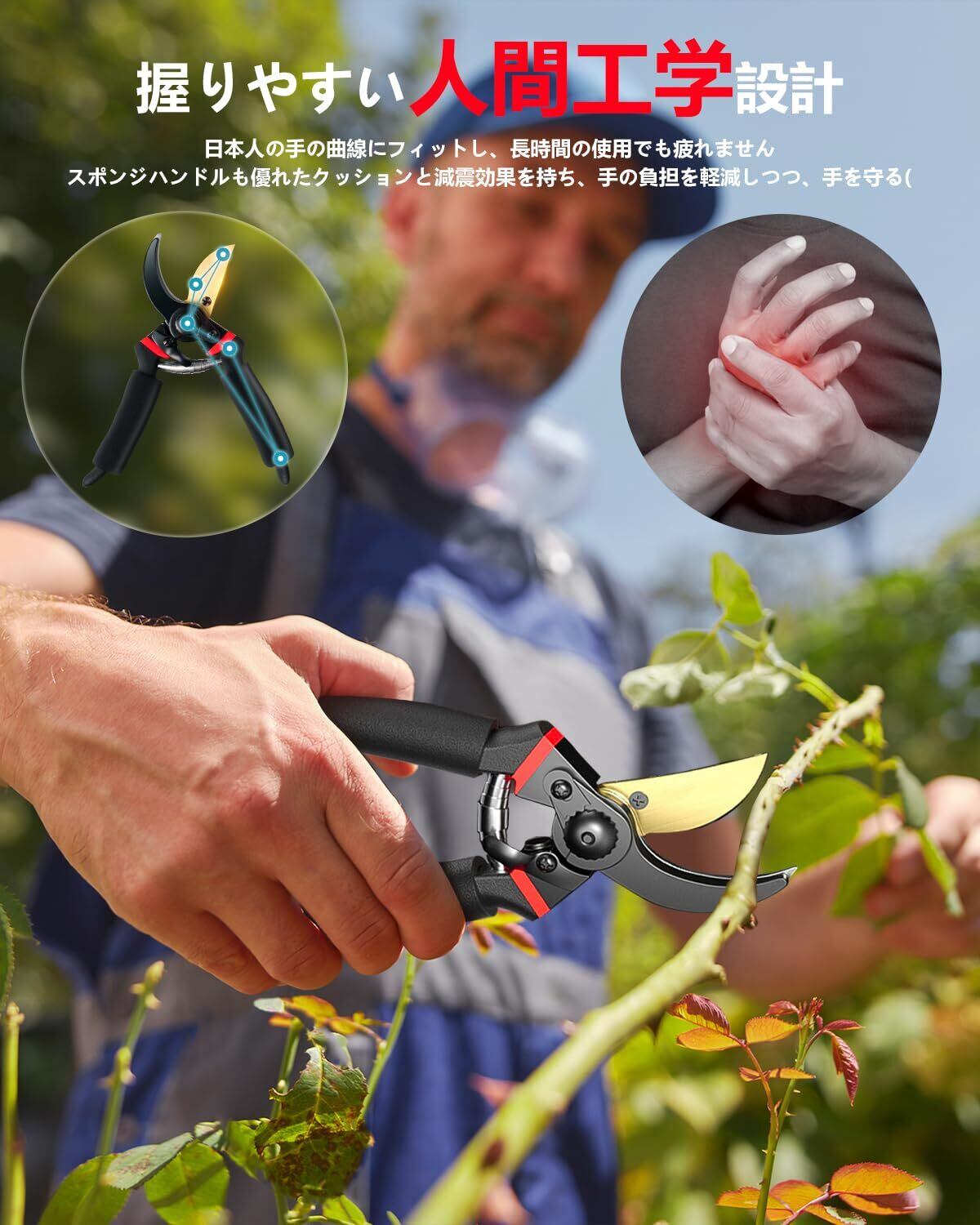 「細かい作業にも対応可能」刃の開き具合は調整可能で、繊細な作業にも対応できます。手が小さい方でも無理なく調整できるストッパーが付いているため、細かい枝の剪定や、力を入れずに軽い切断が可能です。さらに、バネの力で自動的に開く設計が施されており、作業中にストレスを感じることはありません。剪定の途中で手が疲れることなく、スムーズに作業を進めることができます。