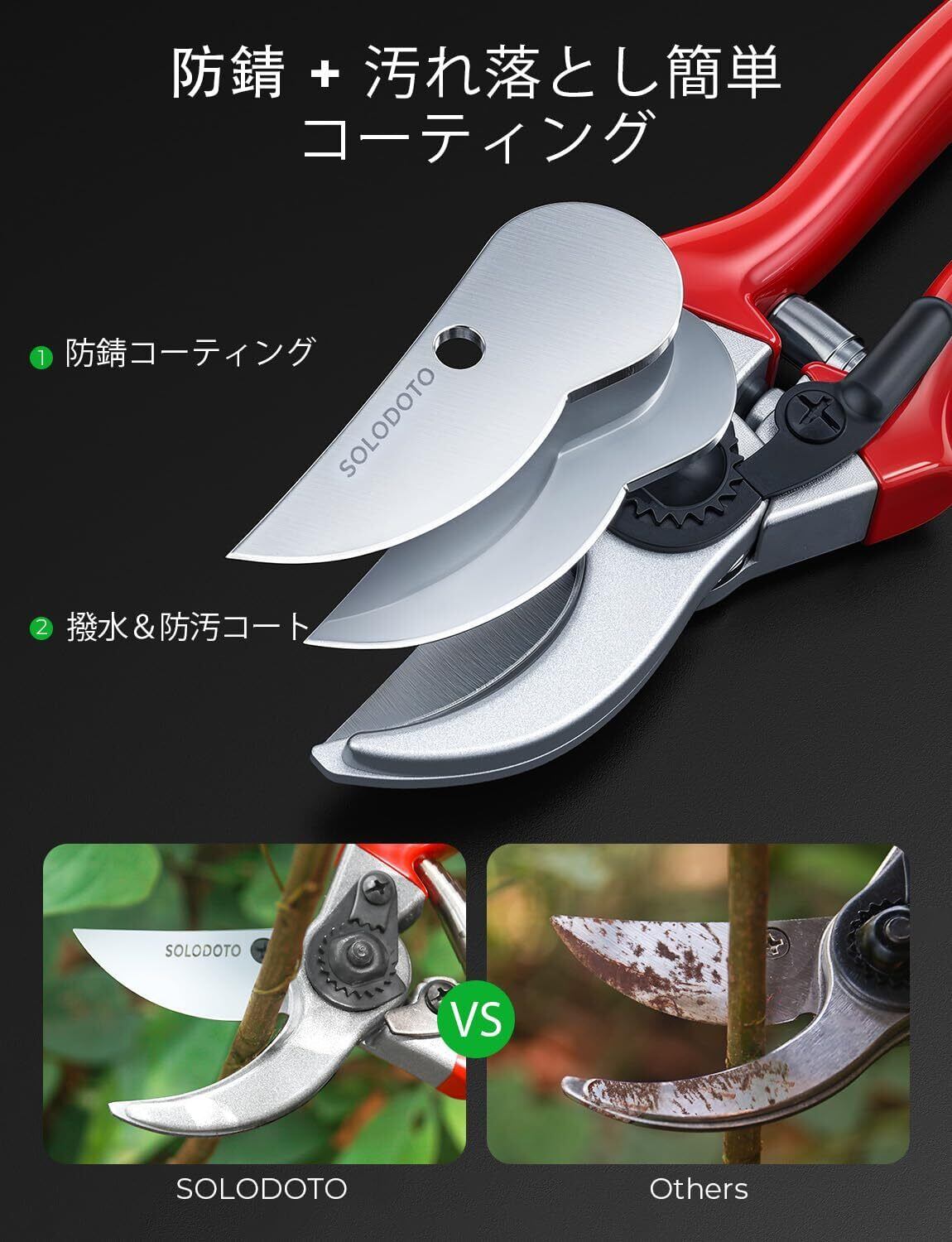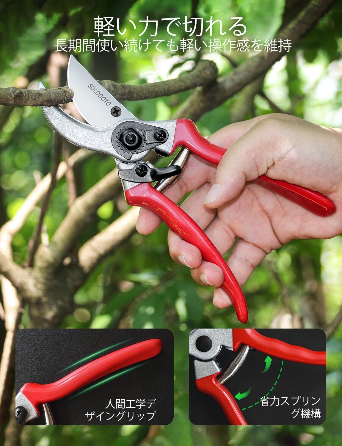 【切れ味4倍アップ、折れにくい高耐久仕様|プロ仕様の剪定バサミ】SOLODOTOの剪定ばさみは、日本製の高品質SK5鋼を使用し、ドイツの精密技術で仕上げられたプロフェッショナル仕様。枝切りバサミとしても優秀で、太めの枝でも力を入れずスパッとカット。刃こぼれや折れの心配がなく、長くご使用いただけます。剪定鋏や園芸ハサミの購入を検討中の方に最適な一品。価格はお手頃ながら、品質は大手ブランド以上を目指しています。もちろん、365日間の無料付き。園芸用品選びで失敗したくない方に、自信を持っておすすめします。