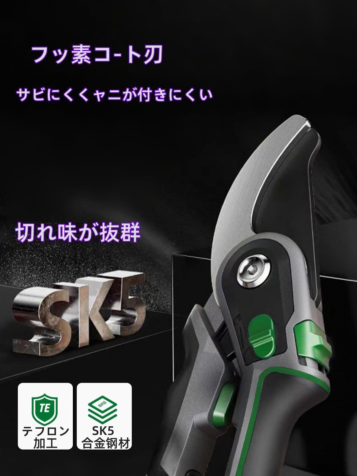 切れ味が抜群: 直径23mmまでの枝や花を簡単にカットできる強力な剪定はさみです。ハサミはテフロン・ノンスティック加工を施したSK5素材製銳利で耐摩耗性に優れ、錆びにくく、切断速度が速く、枝を傷めない。高品質な刃物鋼を使用し、優れた切れ味と耐久性を実現