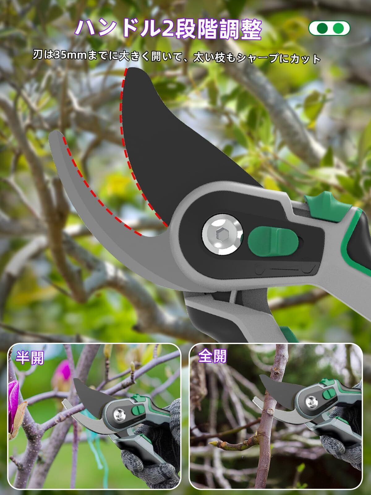 ハンドル2段階調整可: この剪定ばさみは柄の幅を2段階 (半開・全開) に調整できるため、手の大きさや切断するものに合わせて柔軟に対応できます。刃は35mmまでに大きく開いて、太い枝もシャープにカット!生け花、植木の剪定、鉢植え、摘果、農作業のための完璧なはさみです