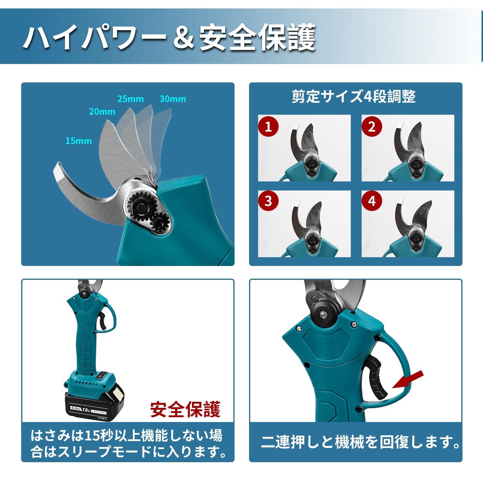 【ハイパワー&安全保護】切断サイズは4階段10mm、15mm、20mm、30mmがあり、初回起動時に30mmの大きな剪定径とボタンでモード切替が可能です。直径30mmまでの樹木を傷つけずに簡単に切断できるパワーがあります。プルーナーにはブラシレスモーターを搭載し、より安定した性能とパワーを実現しました。15秒以上何もしないと、自動的にスリープ状態になり、緑のインジケーターランプが消えます、電動剪定バサミのトリガーを押しても作動しないので、事故防止に役立ち、より安全に使用することができます。電動剪定バサミの寿命が大きく確保されています。