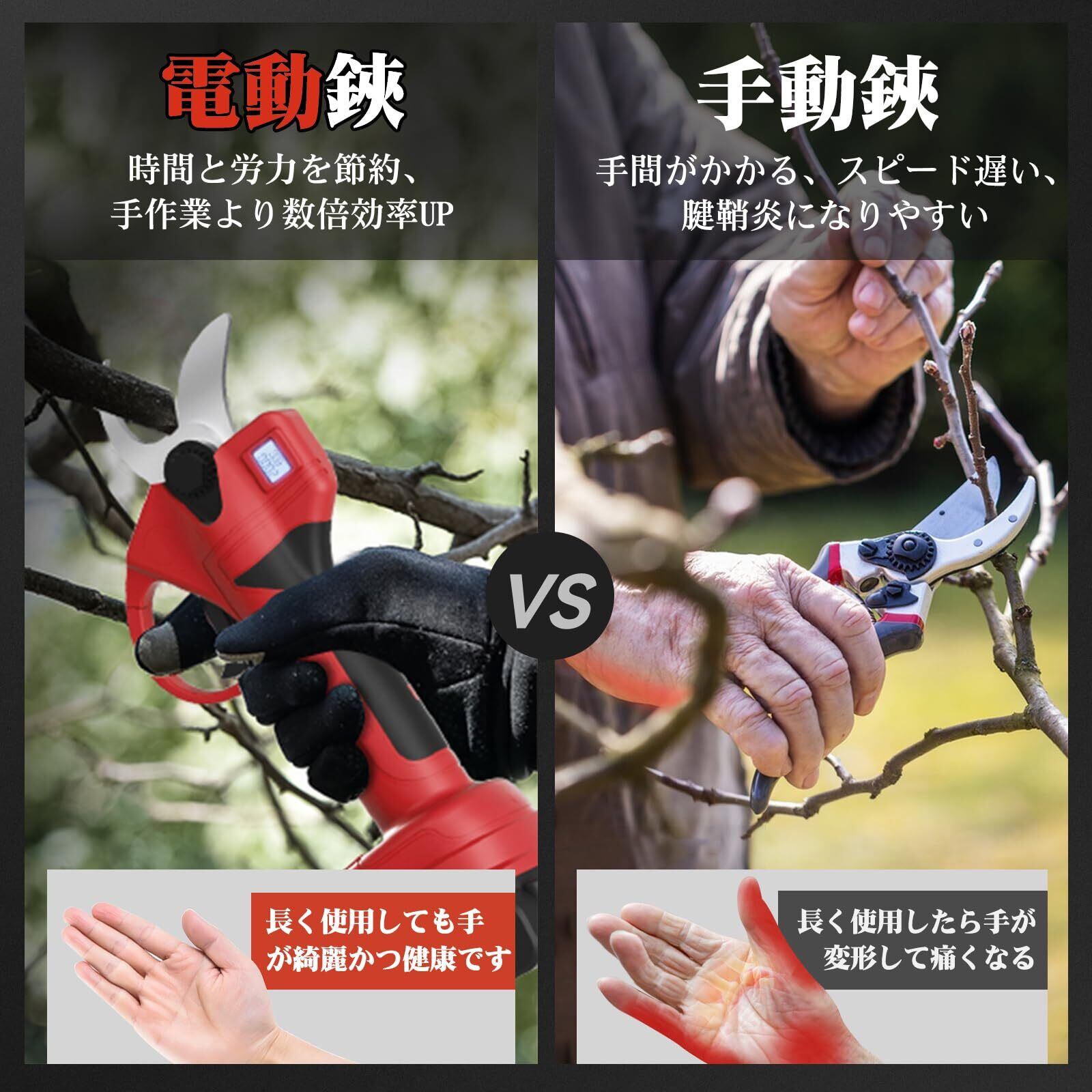 【SK5ブレード&切れ味抜群】鋏の刃は日本製のSK5高炭素テフロン鋼から作られて高硬度で切れ味抜群です。ブラシレスモーター搭載してパワーが強くて、30mmまでの生木を1秒に瞬時に切断でき、切れ味が良くて切断面が平にキレイ、植木の健康を守れます。