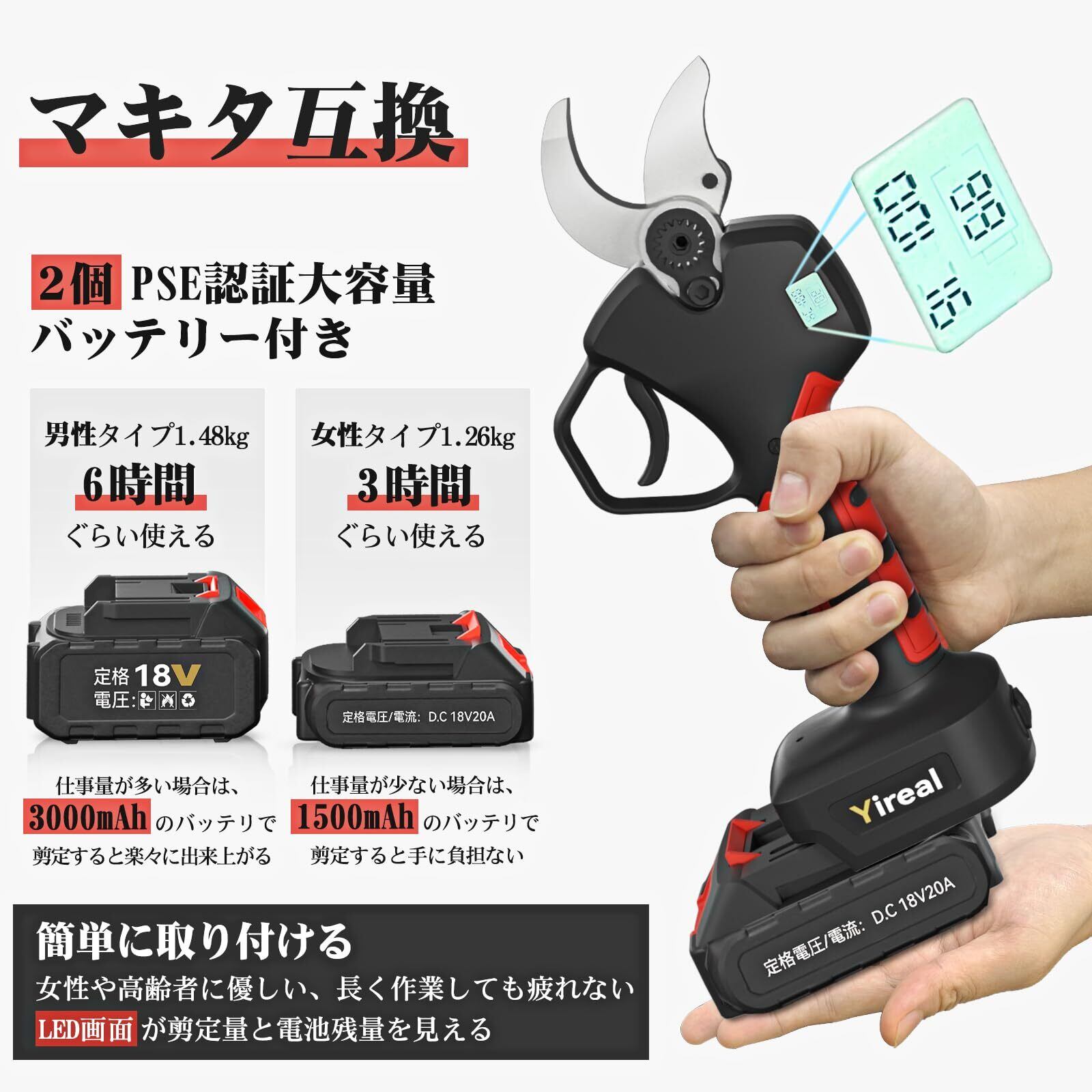 【PSE認証取得&マキタ18Vと互換】この充電式剪定は人間工学に基づき軽くて持ちやすいタイプです、女性や力が小さい方のために二種類のバッテリー用意しています。女性タイプは電池を含めて1.26㎏1500mAhで3時間ぐらい連続切断でき、男性タイプは1.48㎏3000mAhで6時間ぐらい連続切断できます、4500mAh大容量なので一日の仕事に充分対応できます。バッテリーは既にPSE認証取得済なのであんぜんにご使用できますし、マキタ18Vバッテリーと互換できるし、非常に便利です。