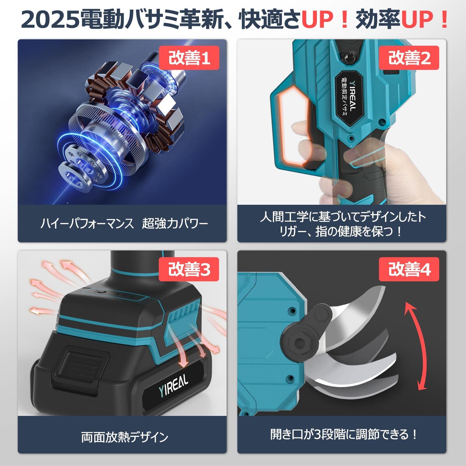 【2025改良強化&山本造園会社監修】Yirealの充電式剪定鋏は切断径42mmの枝を楽々に切れます。改良強化版のブラシレスモーターにより、より強い切断力、切れ味が抜群、優れた耐久性を実現しています。弊店の電動バサミは山本造園会社監修で植木屋さんが楽に剪定作業するために開発しました。この10年に世界中2万の造園会社に10万以上の植木屋さんが利用しています。