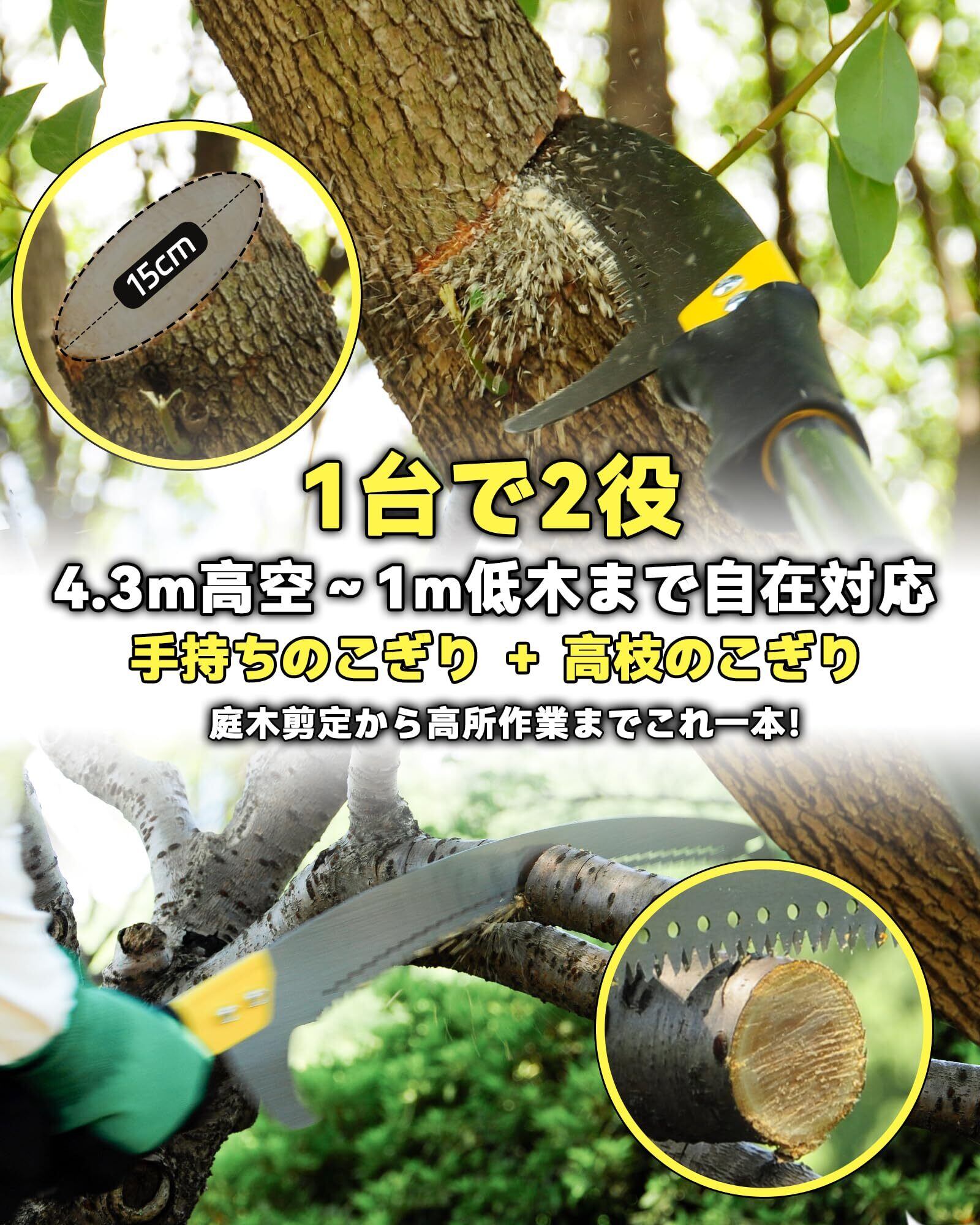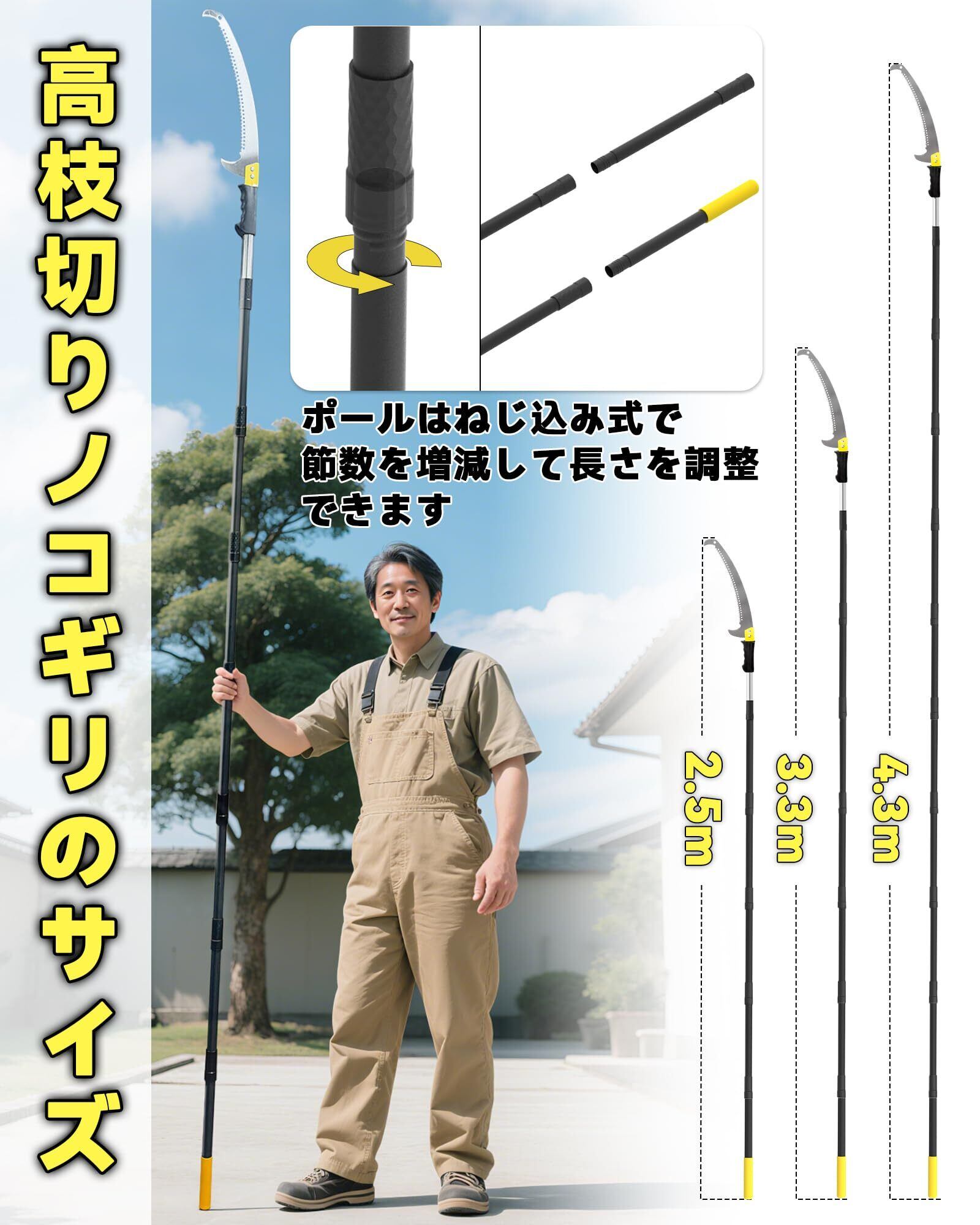3サイズから選べる: このノコギリは手持ち用と高枝用の2通りで使え、握りやすい防滑グリップ付きで手持ち作業も快適で安全です。2.5m・3.3m・4.3mの3モデルを展開し、低木や庭木の整枝から庭園全般、高木の高所枝切りまで用途に合わせて選べます。