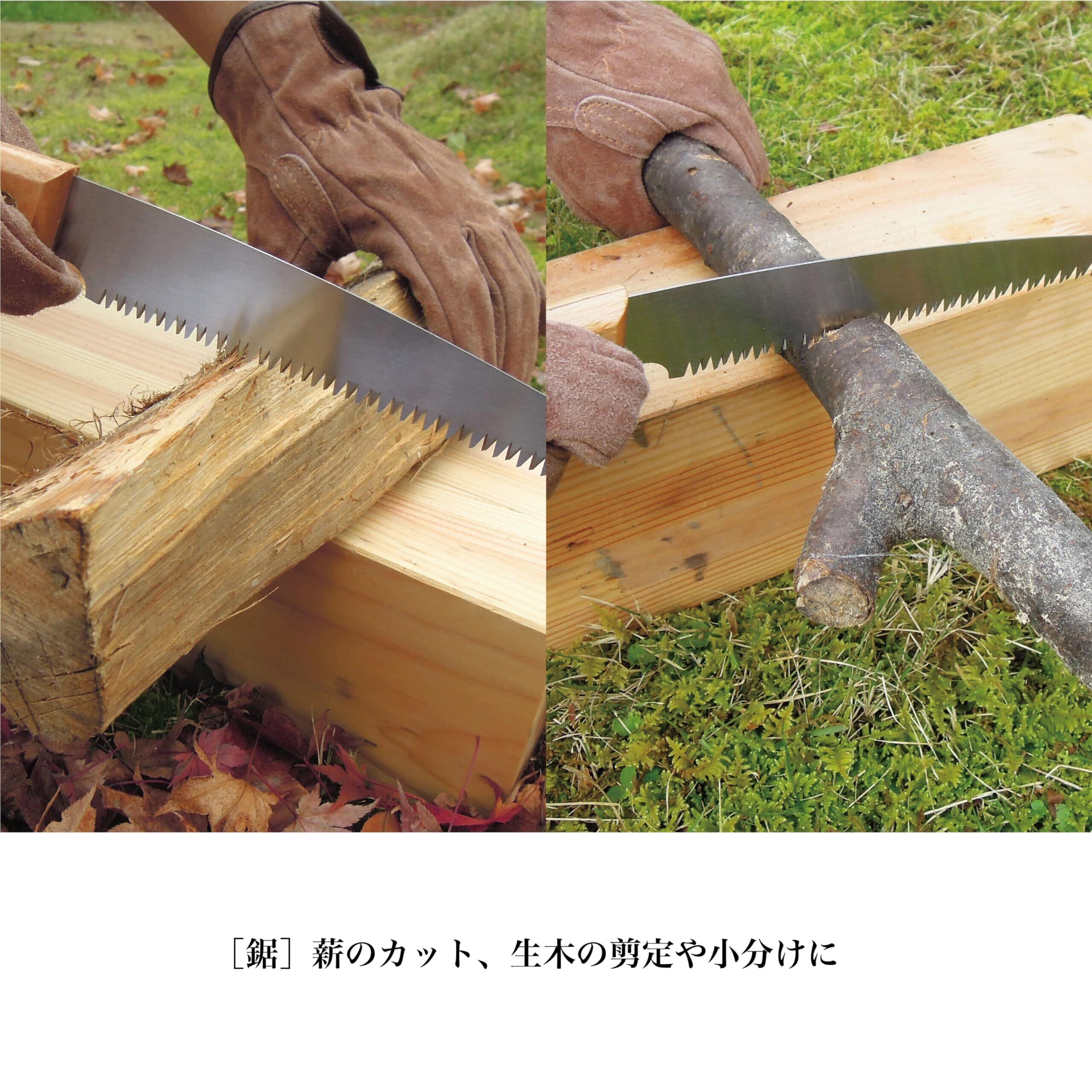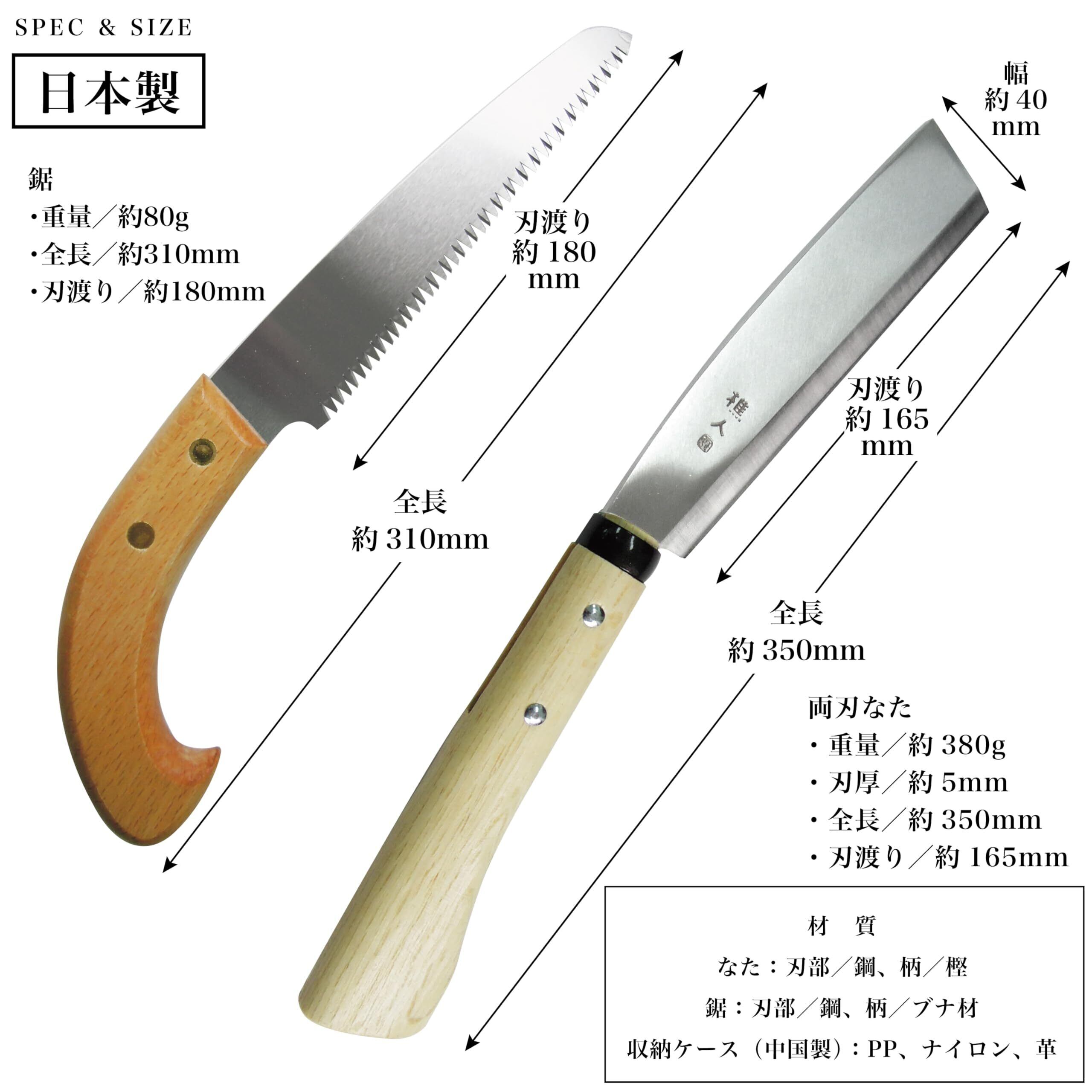 サイズ:鉈/全長350mm、刃身165mm、鋸/全長340mm、刃身180mm