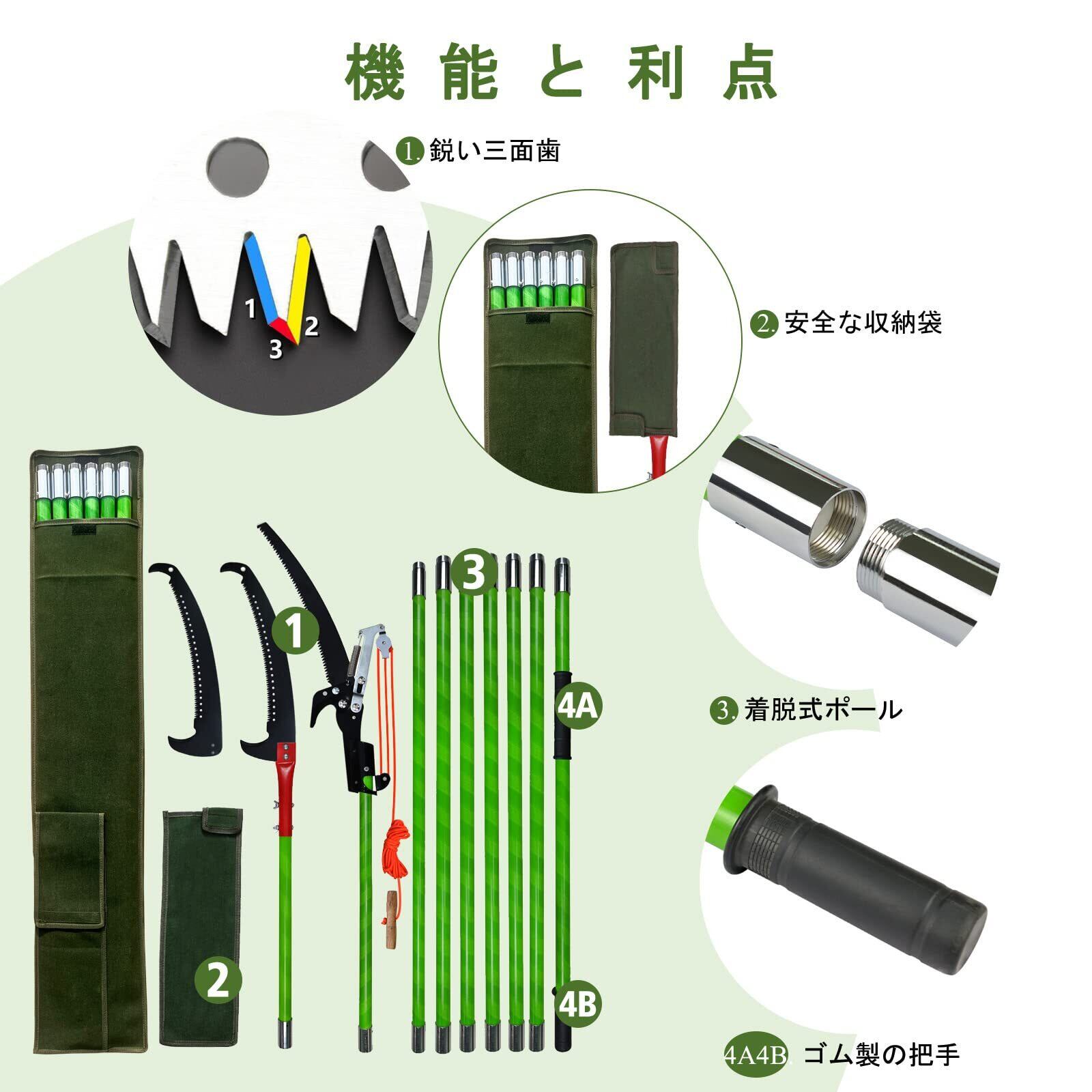 8メートルの枝切りポール:8メートルまで伸びる頑丈なツリートリミングシステムで、高い枝をすばやく簡単に切ることができます。木の高さに合わせてポールの長さを調整できます。