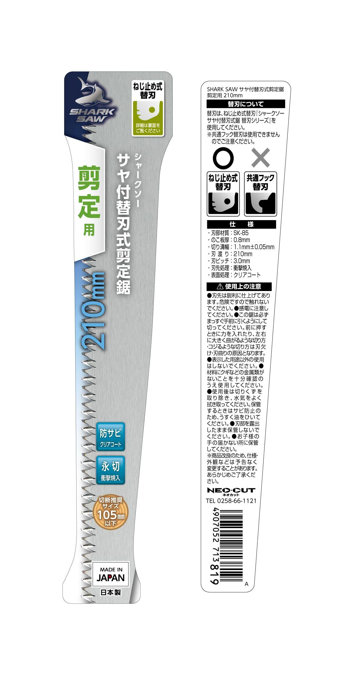 のこ板厚:0.8mm、切り溝幅:1.1mm±0.05mm、刃渡り:210mm、刃ピッチ:3.0mm