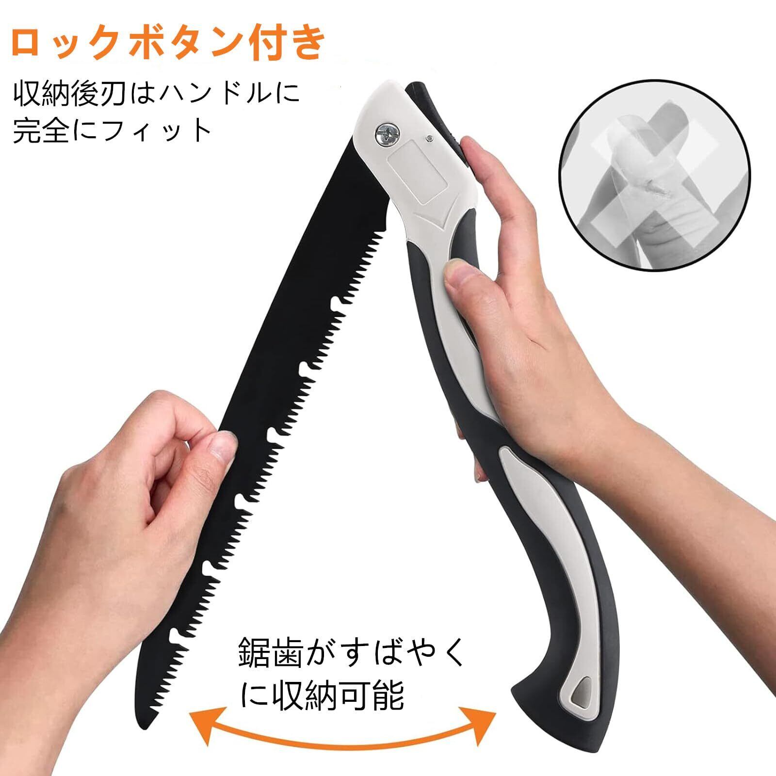 【ロックボタン付き】ボタンで開閉、鋸歯がすばやくに収納可能です。収納後刃はハンドルに完全にフィットしますから、閉じたときに歯が露出することの心配いりません。ボタンを押してブレードの開閉を切り替え、ブレードを最大位置まで開けると鋸が自動ロックされます。
