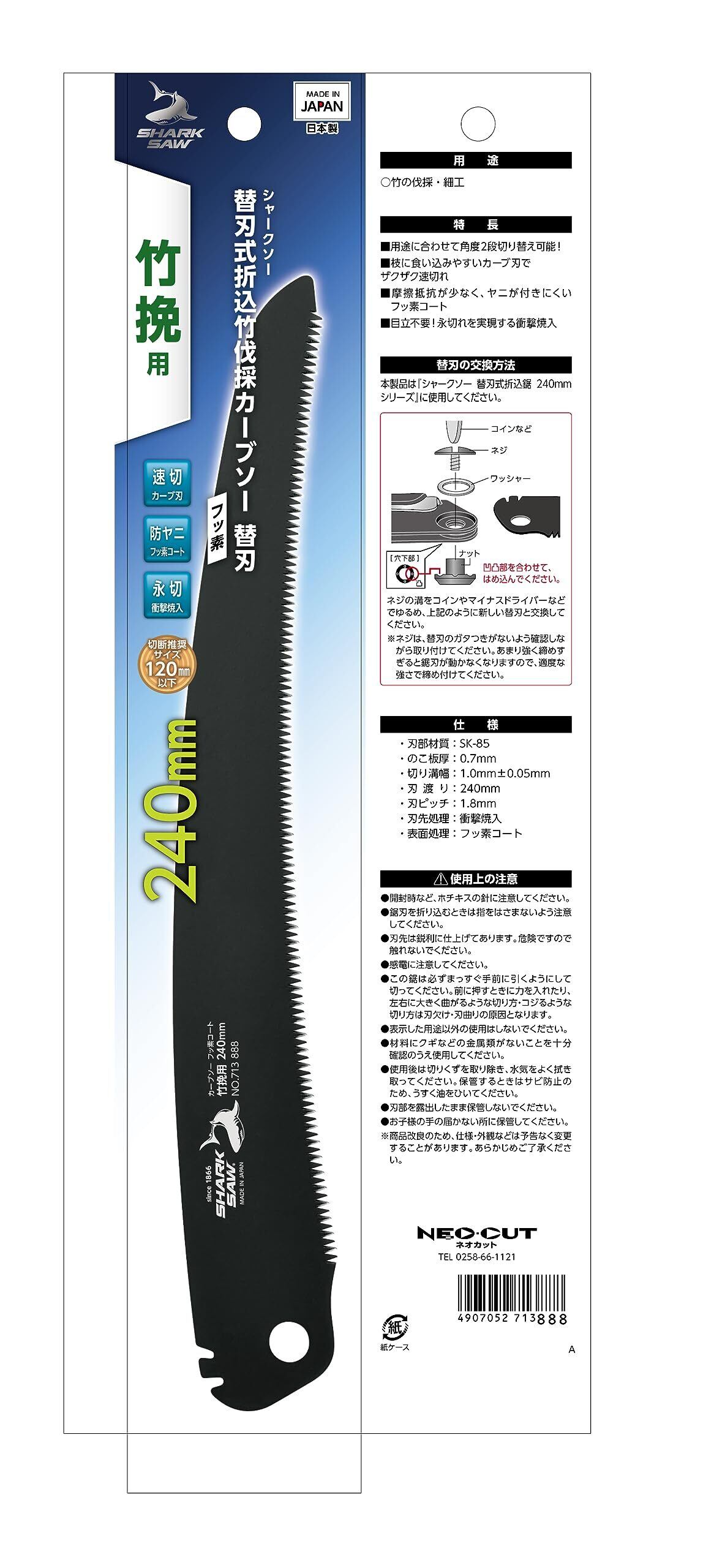 高儀(Takagi) シャークソー 替刃式 折込 竹伐採 カーブソー フッ素 竹挽用 240mm 日本製 のこぎり ノコギリ 鋸 折込のこぎり 片刃 替え刃 園芸 細工 速く切れる 防ヤニ 永切