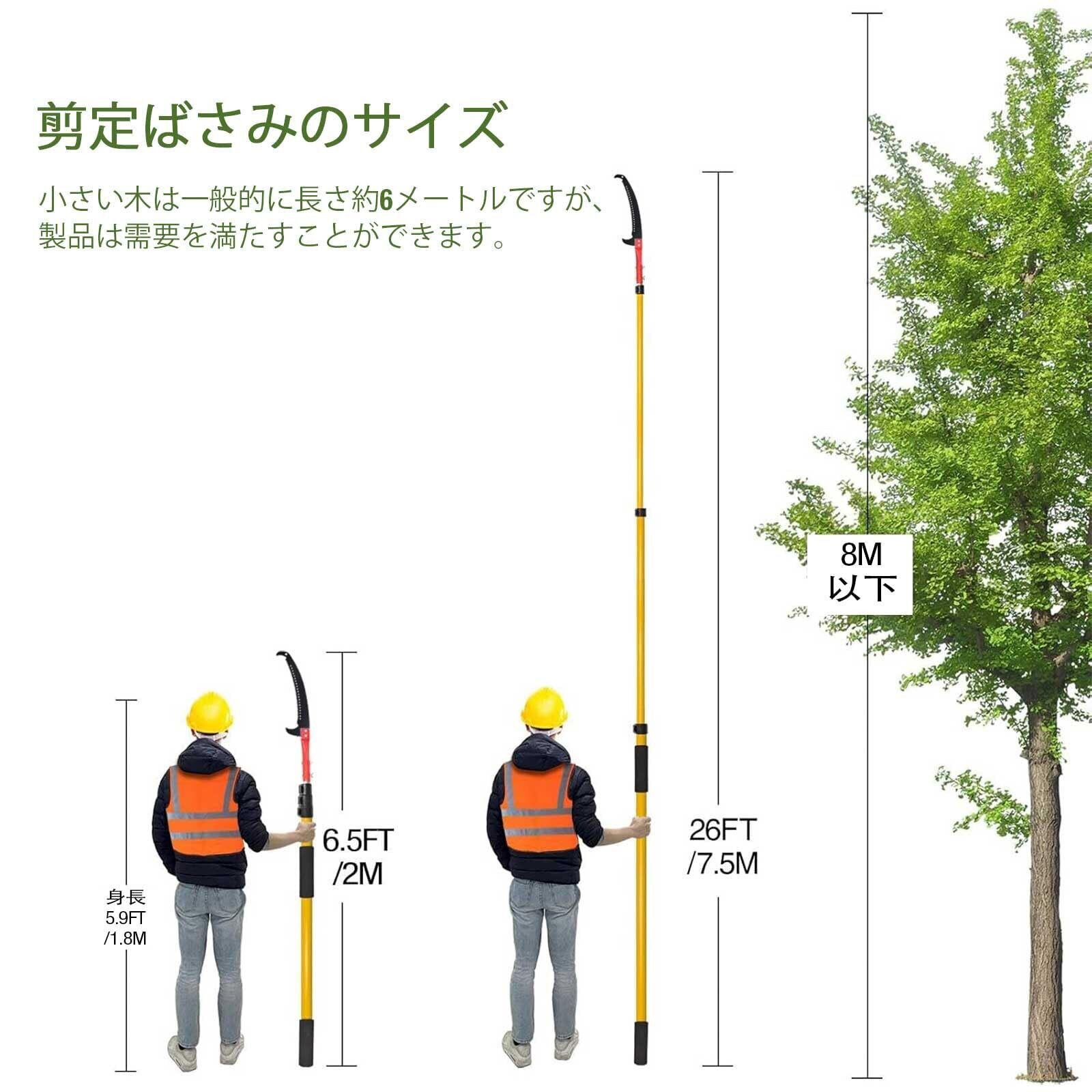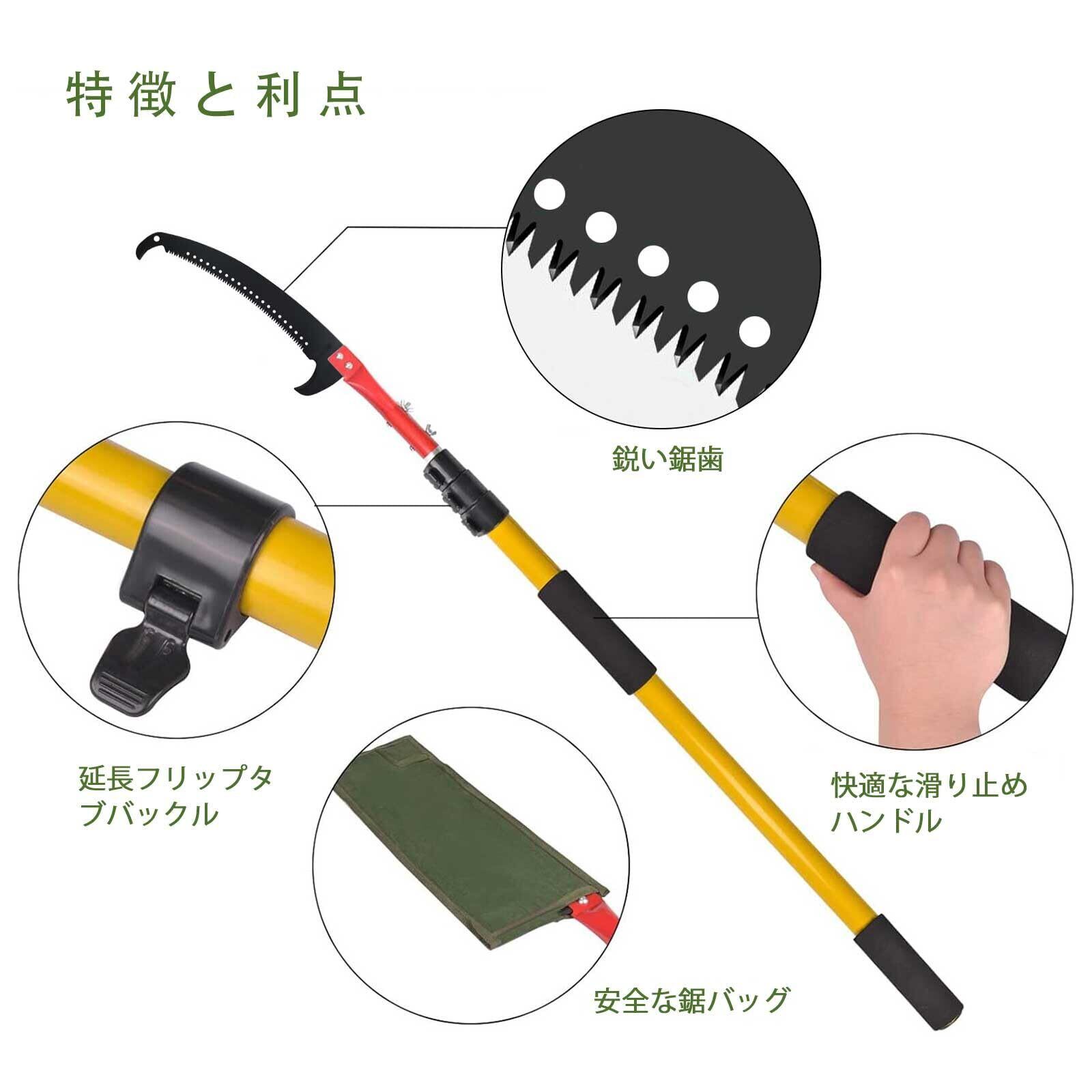 伸縮ポール:4段伸縮ポールソーは7.5メートルまで伸ばすことができます。ポールは、フリップタブロックで 2 ~ 7.5 メートルの任意の長さに調整できます。はしごを登らずに高い枝やつるを切り、低い枝を曲げたりひざまずいたり、密集したりとげのある低木に手を伸ばしたりせずに切るのに最適です