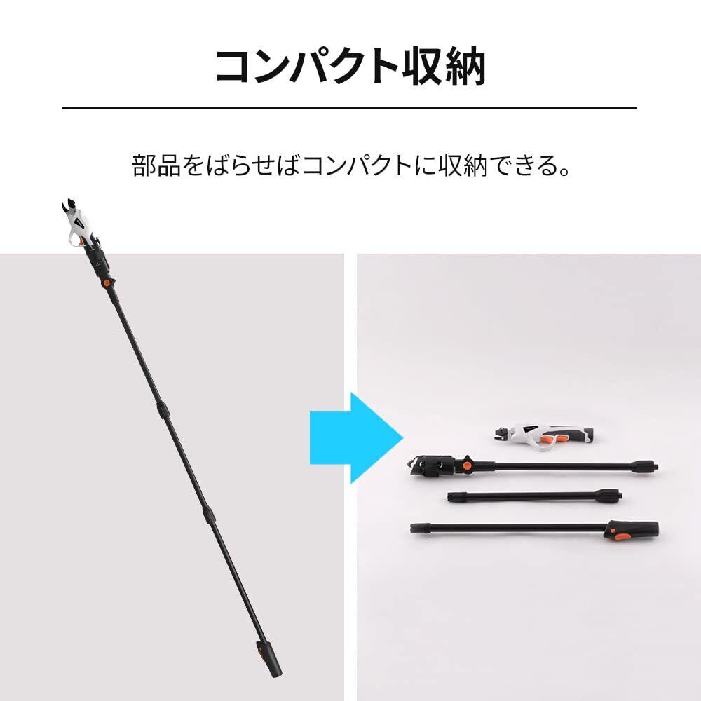 低い木はハンディで、高い枝切りには延長ポールを装着して剪定できます。