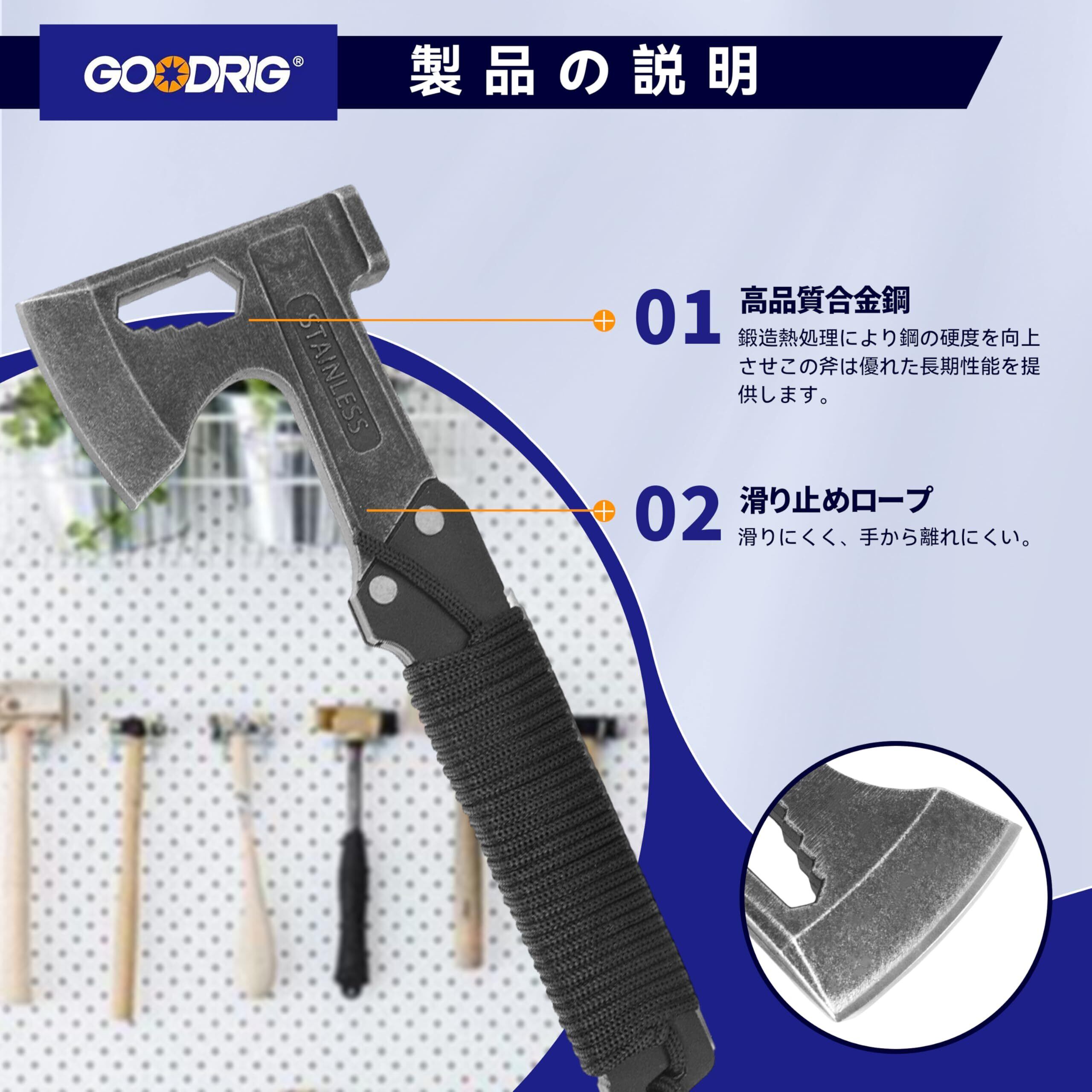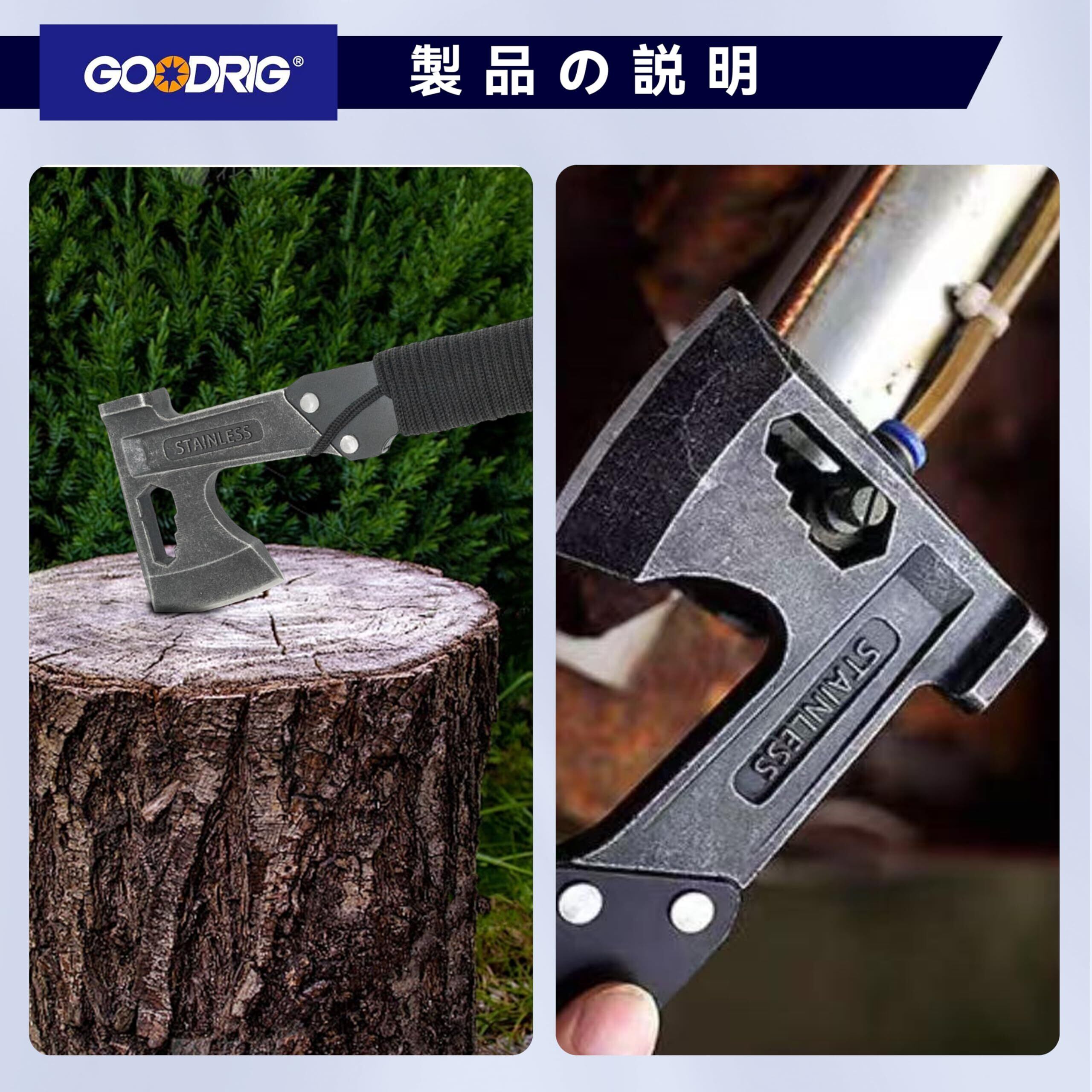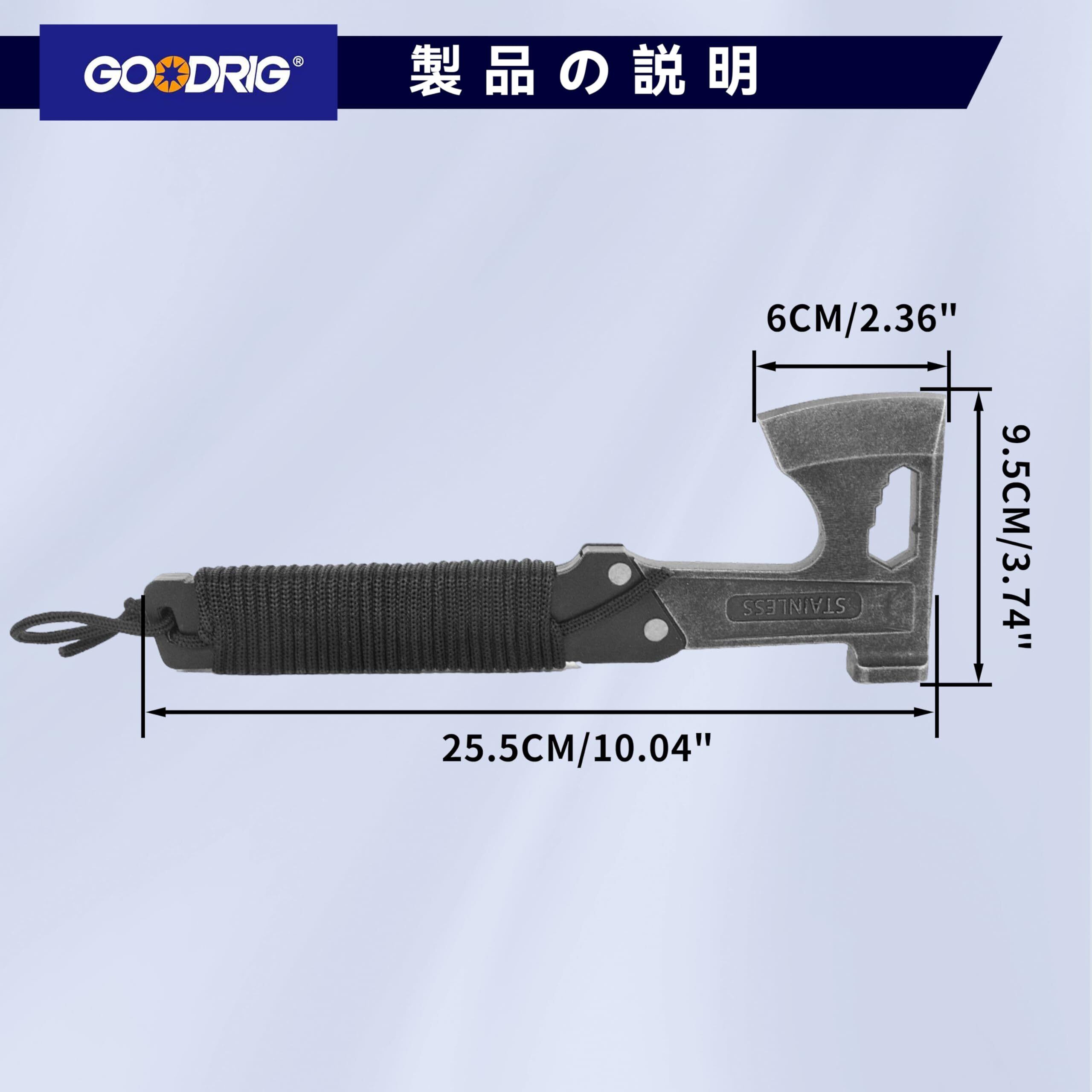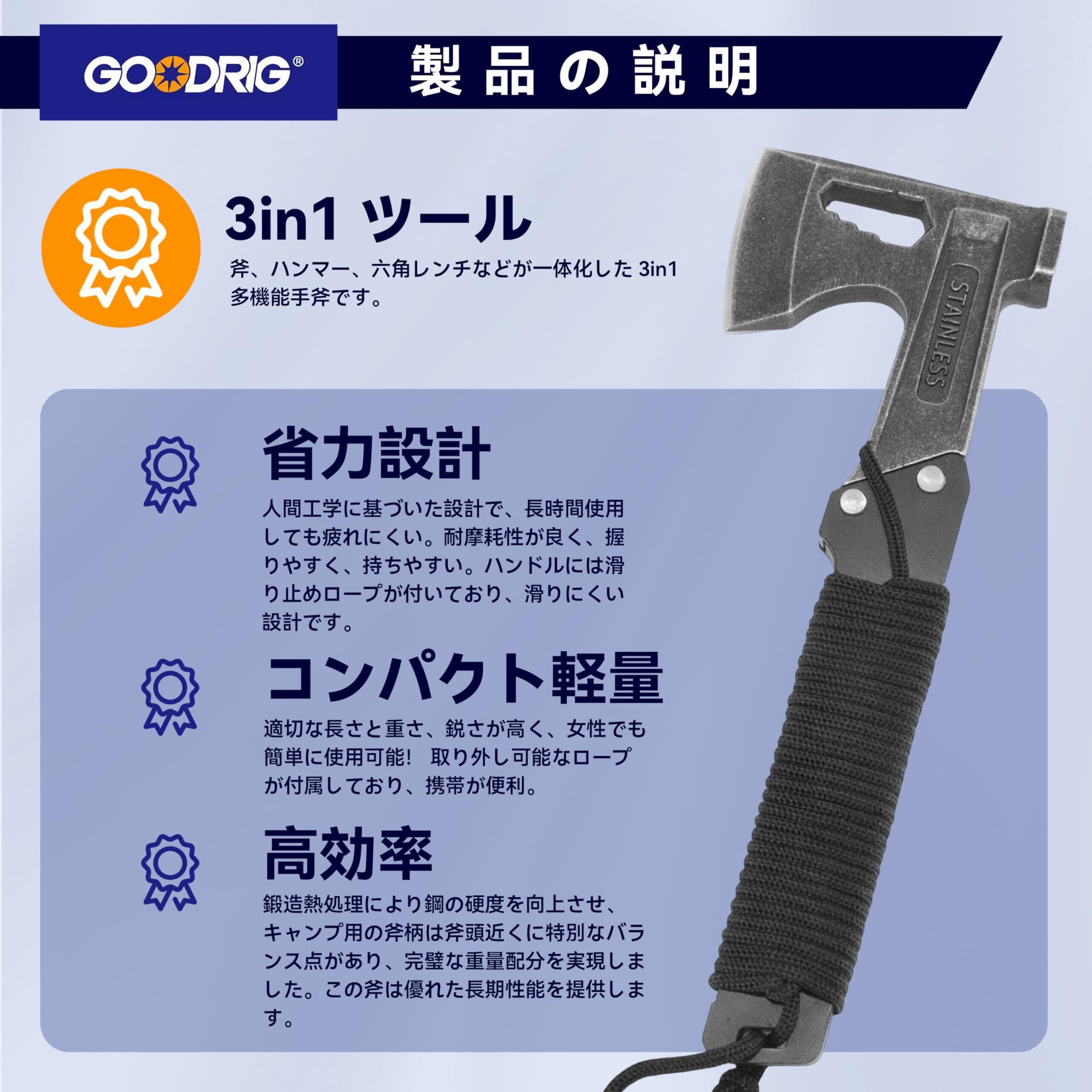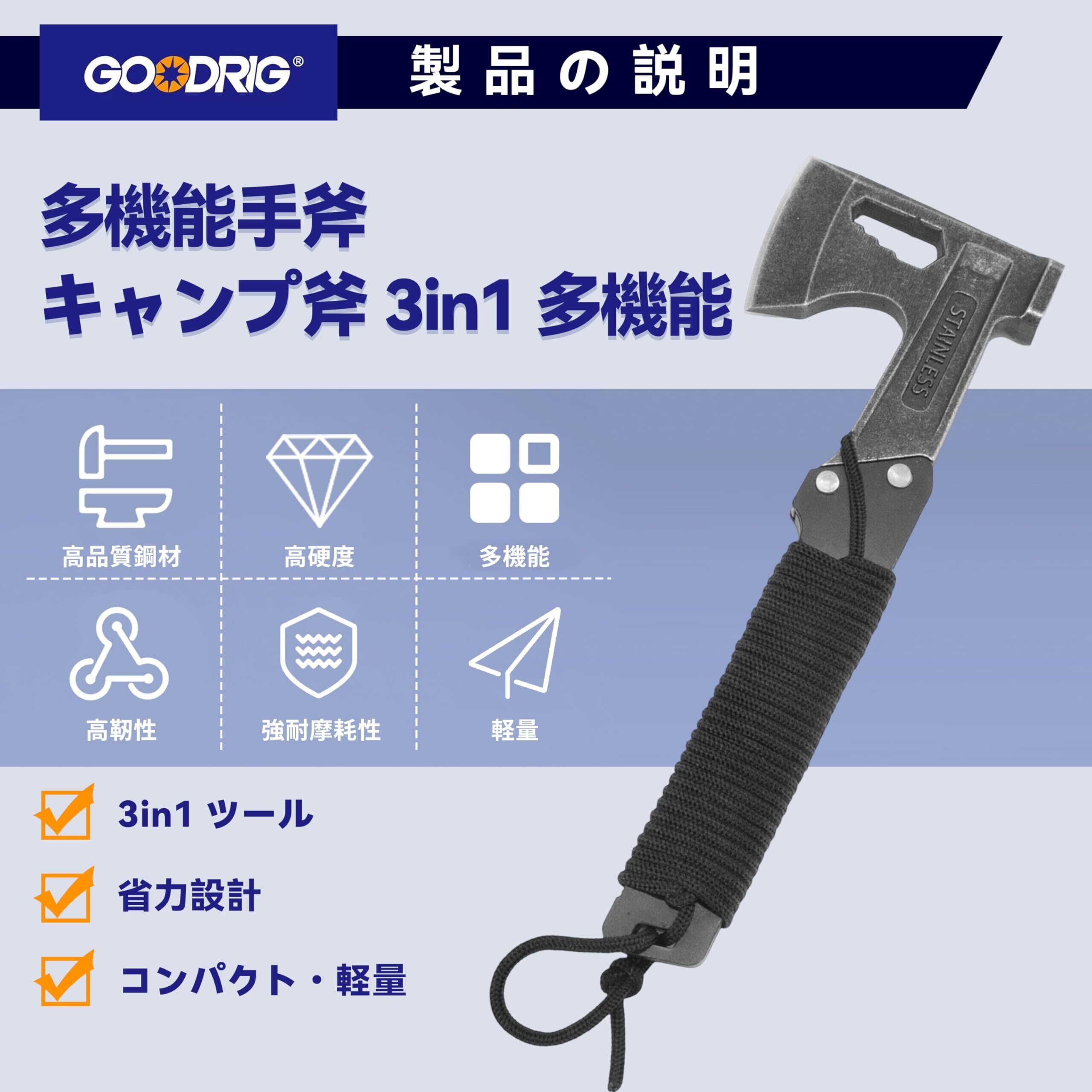 GOODRIG 斧 多功能手斧 野营斧 三合一多功能 砍柴 切割 制作篝火 家庭 キャンプ 緊急 非常時