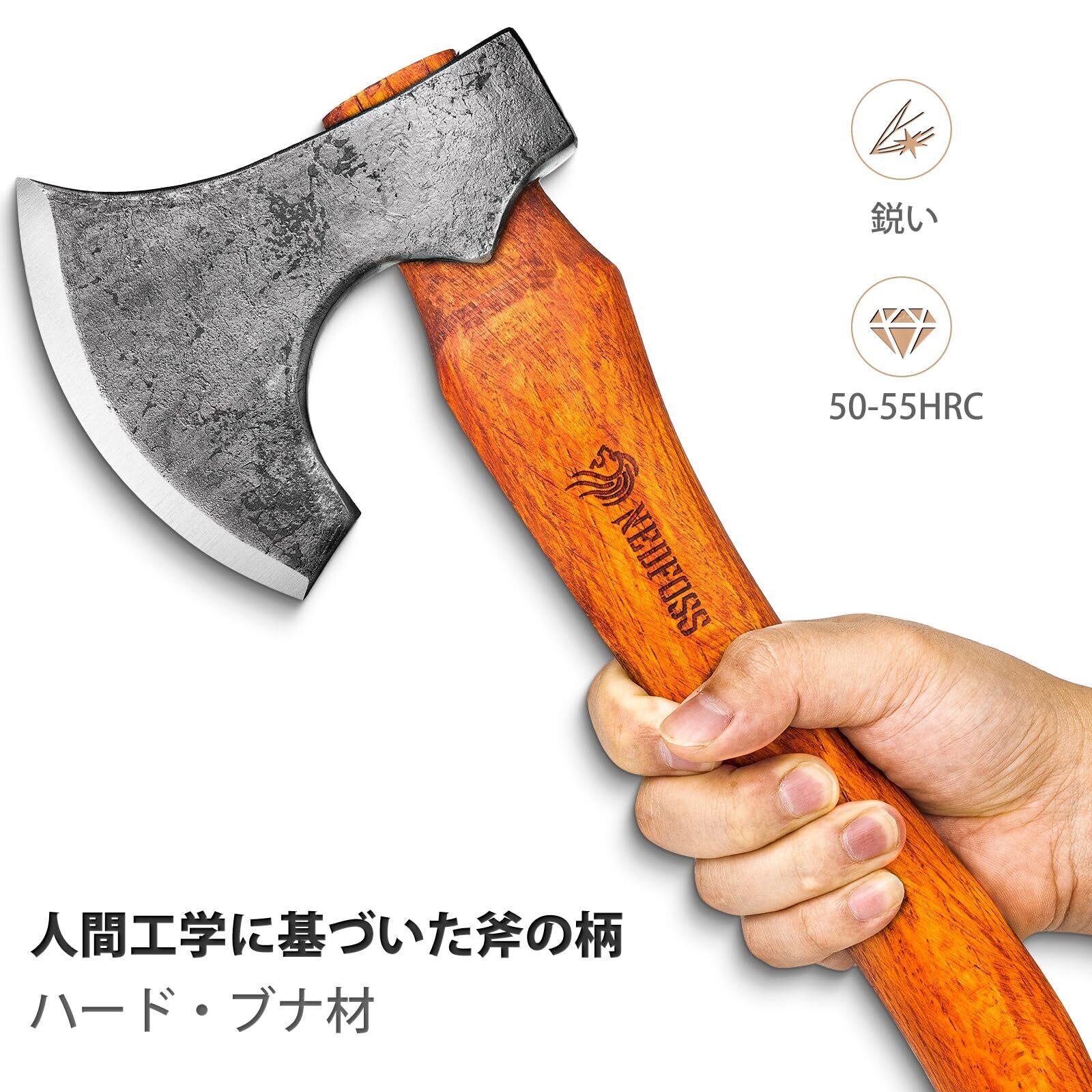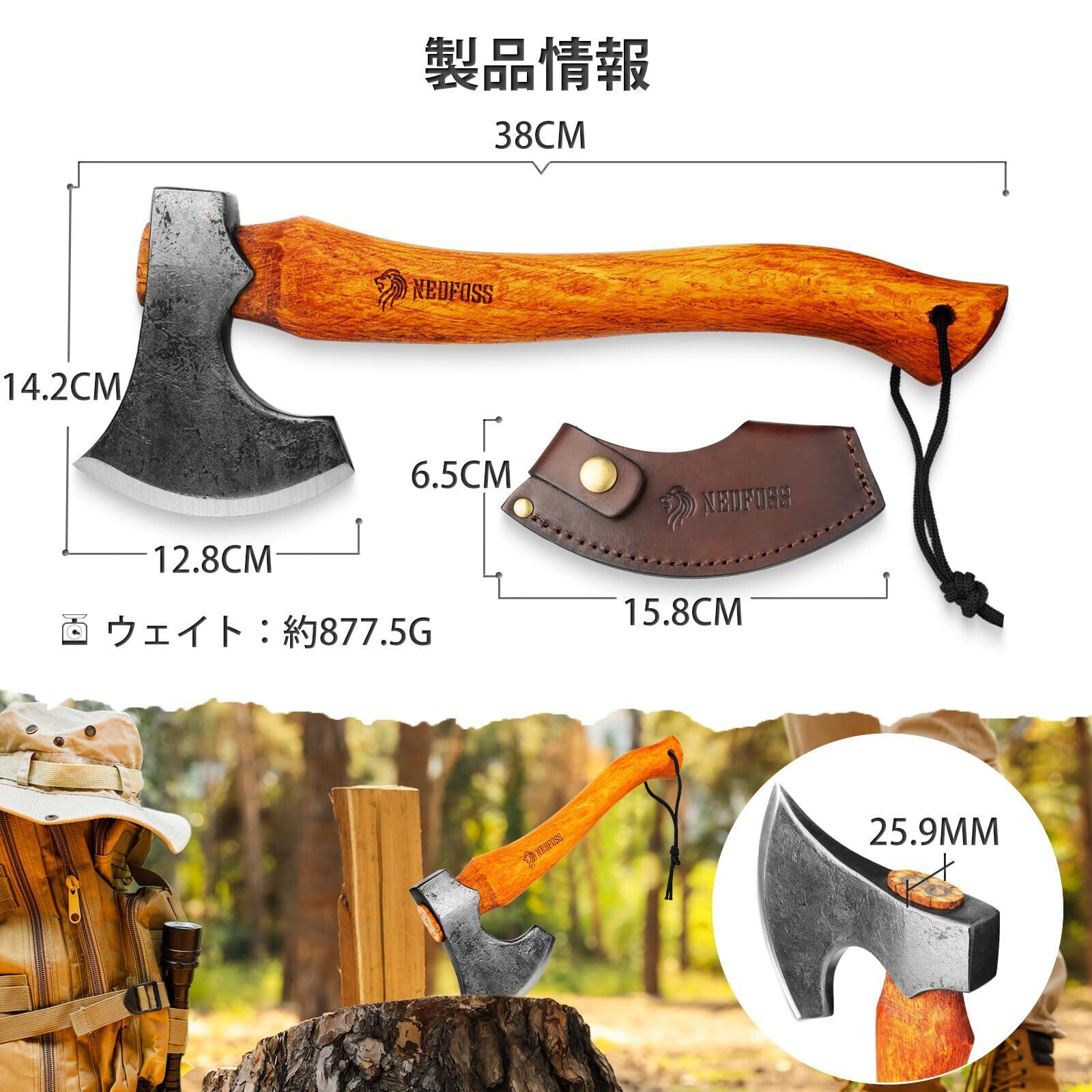 斧のサイズ:全長38cm 刃渡り 12.8cm 硬度:50-55HRC 柄: ブナ 専用カバー付き 重量:878g