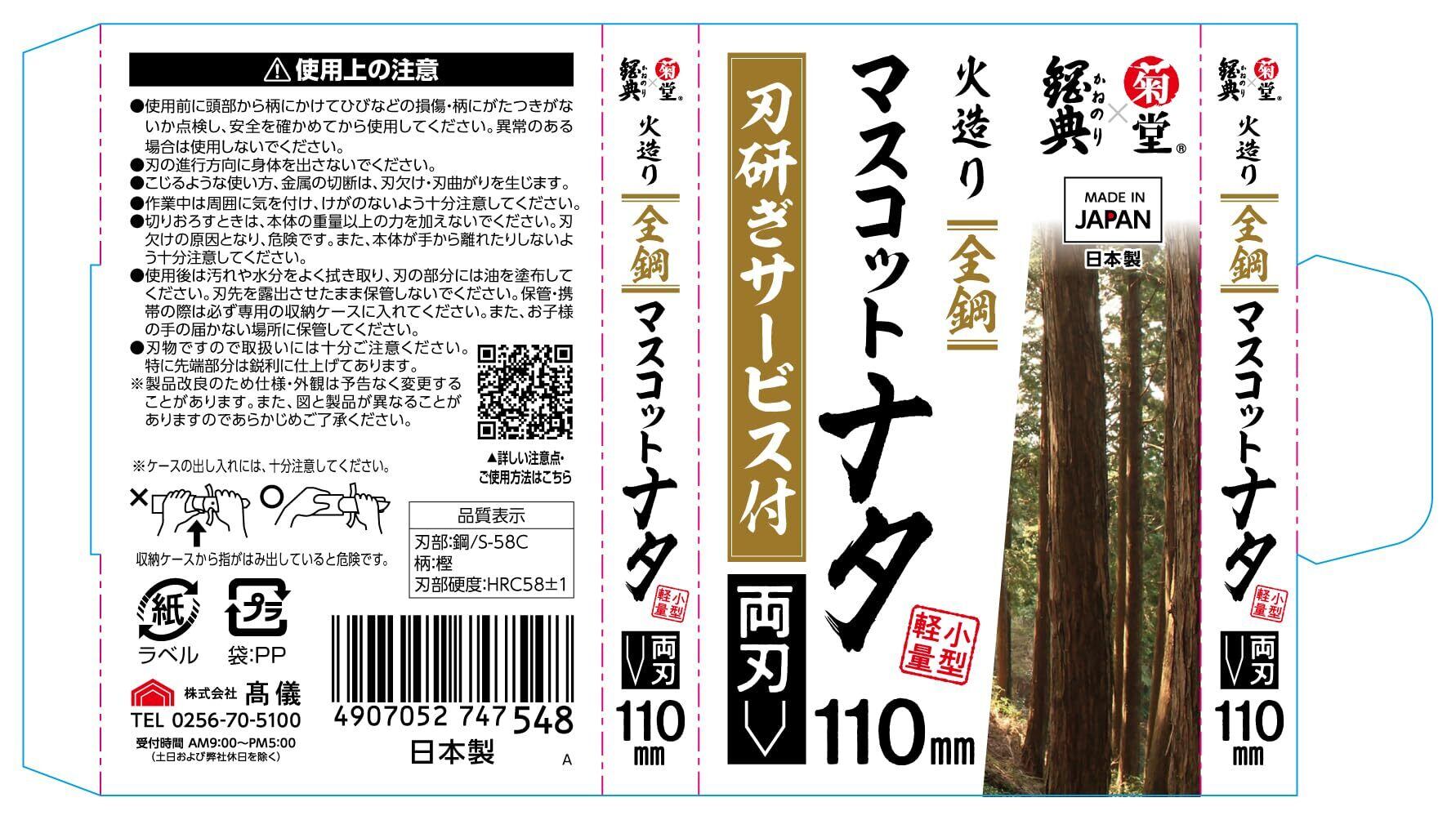 髙儀(Takagi) 経典×菊堂 マスコットナタ 両刃 110mm 日本製 薪割り キャンプ 軽量 小型 刃研ぎサービス付き 園芸 鉈 高儀 たかぎ TAKAGI