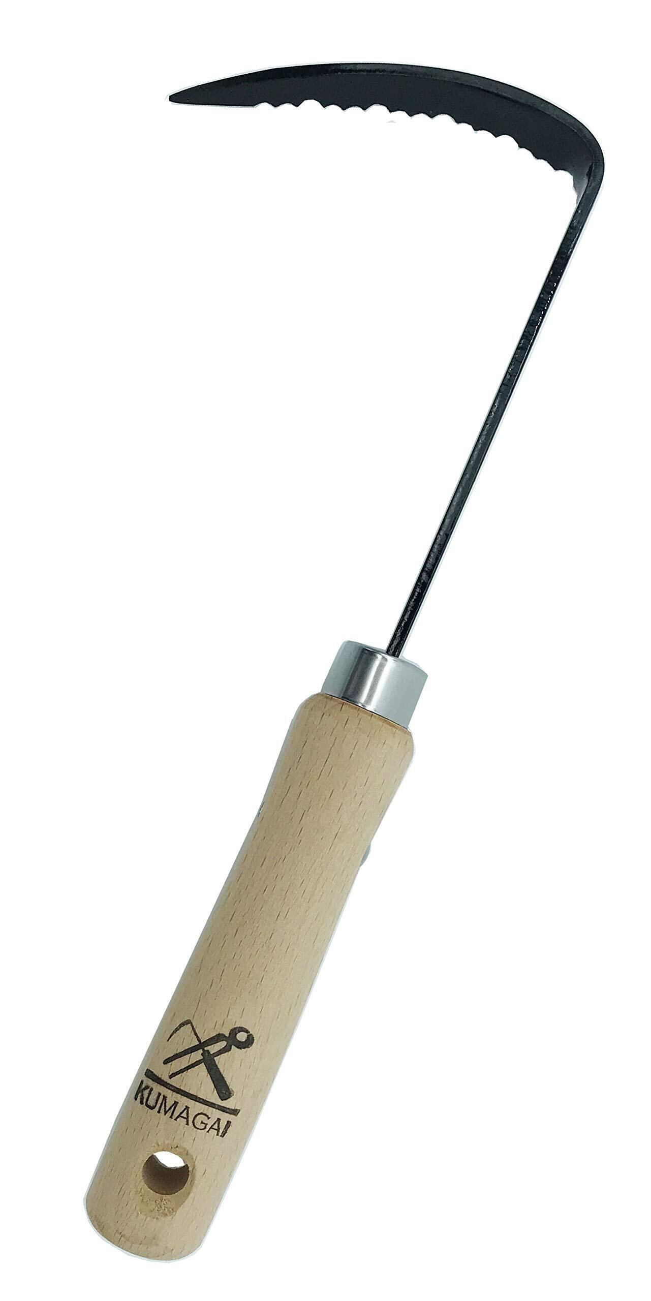 熊谷鉄工所製造の草取りカギカマ(右手用)です。折れない・曲がらない、強靭な刃先 鍛冶職人が特別な焼き入れ方法で作られた頑丈な刃は砂利が多いところでも大丈夫 刃が湾曲しているため土への刺さりが抜群です。
