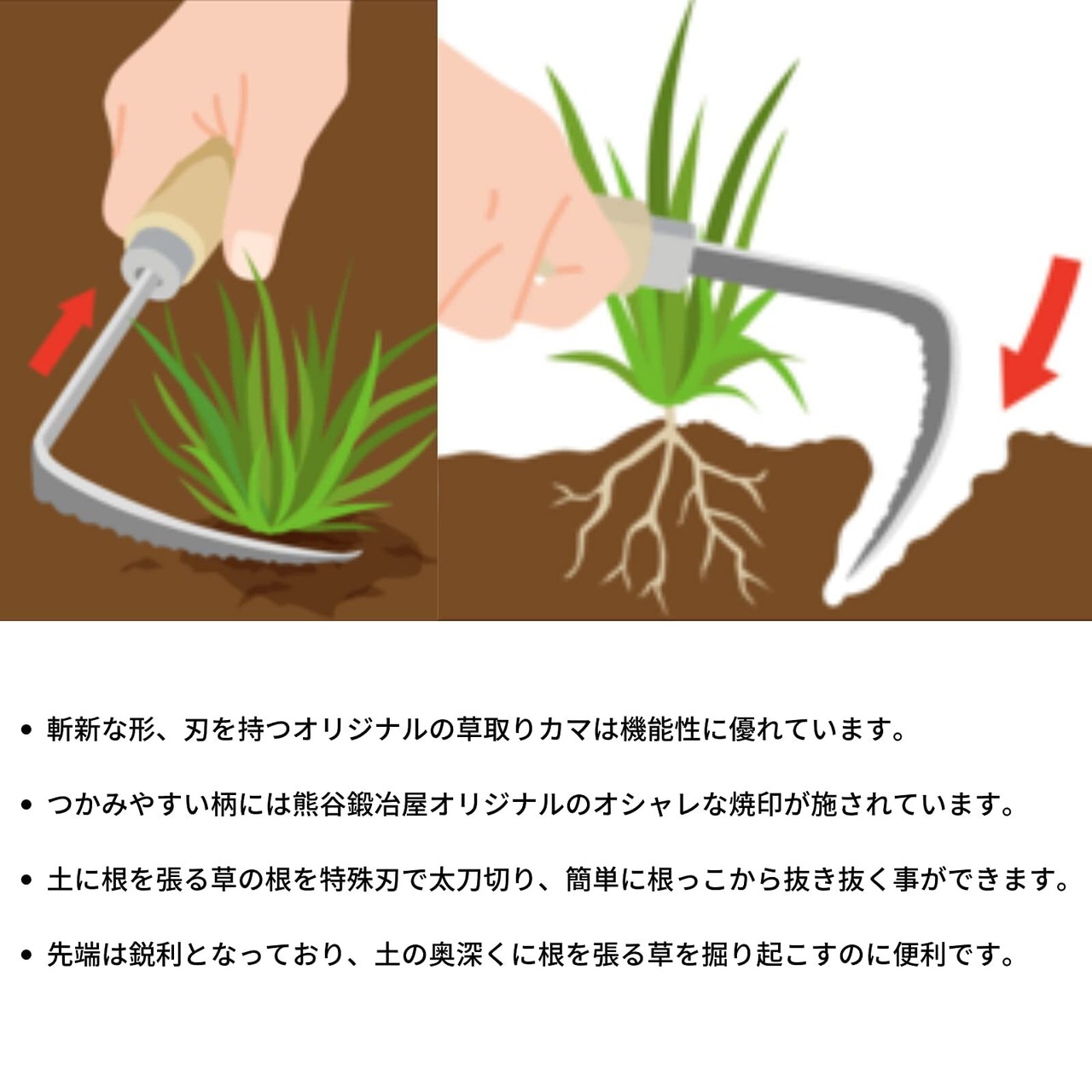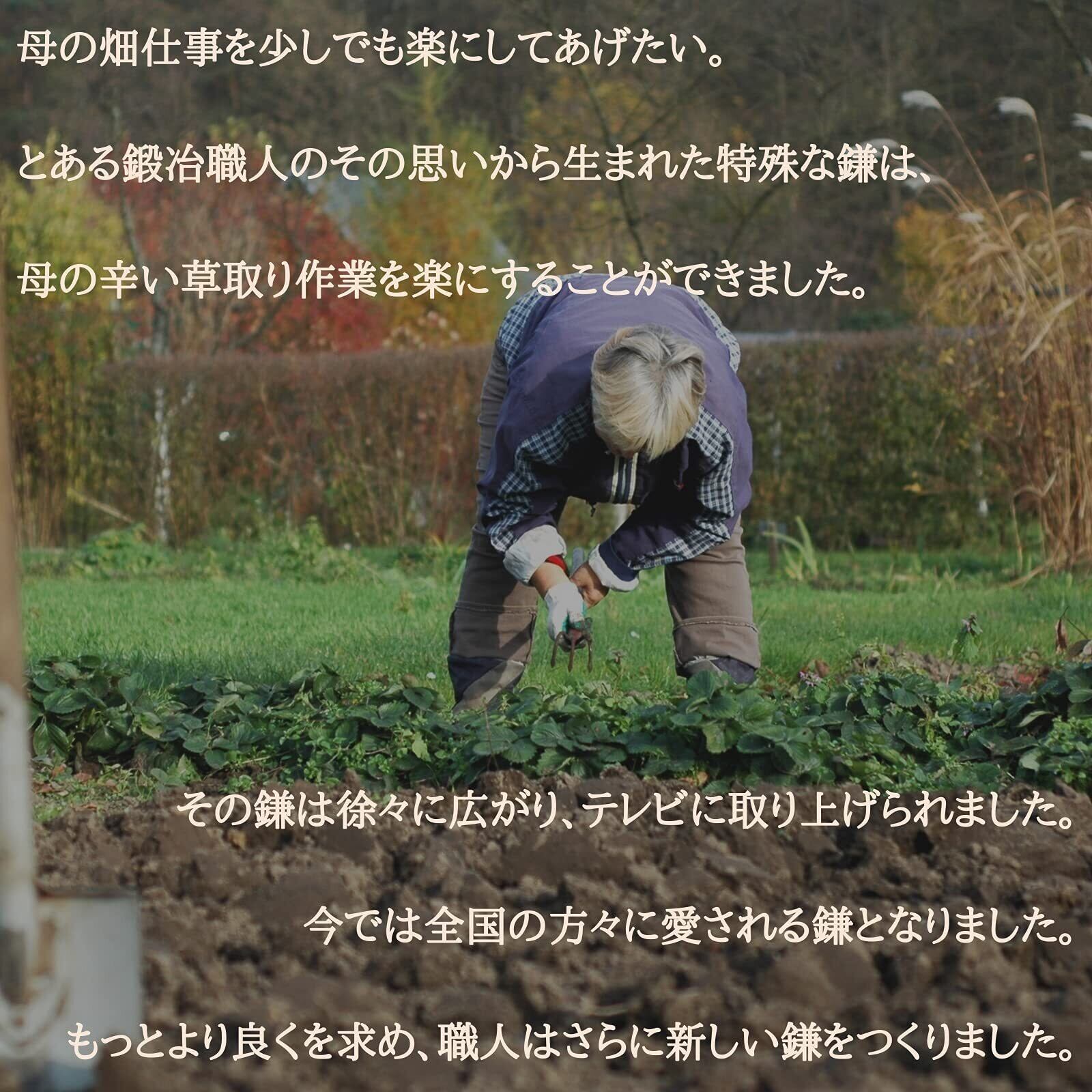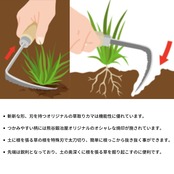 【草取カギカマで草取りがはかどる理由】草取カギカマは独自の窓付波目刃のために切れ味が良く、草の根を切らずに簡単に草が取れます。また、波目刃のために取った草が集めやすく片方の手だけでも作業ができます。刃板部がせまいので、ミゾや石垣の狭い場所にも最適。刃が湾曲しているので土への刺さりが抜群で、根の深い草も簡単に取れるのです。