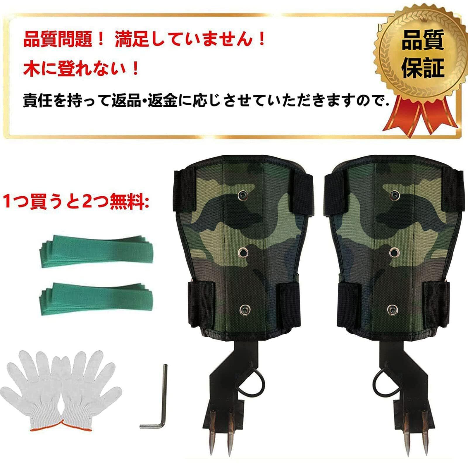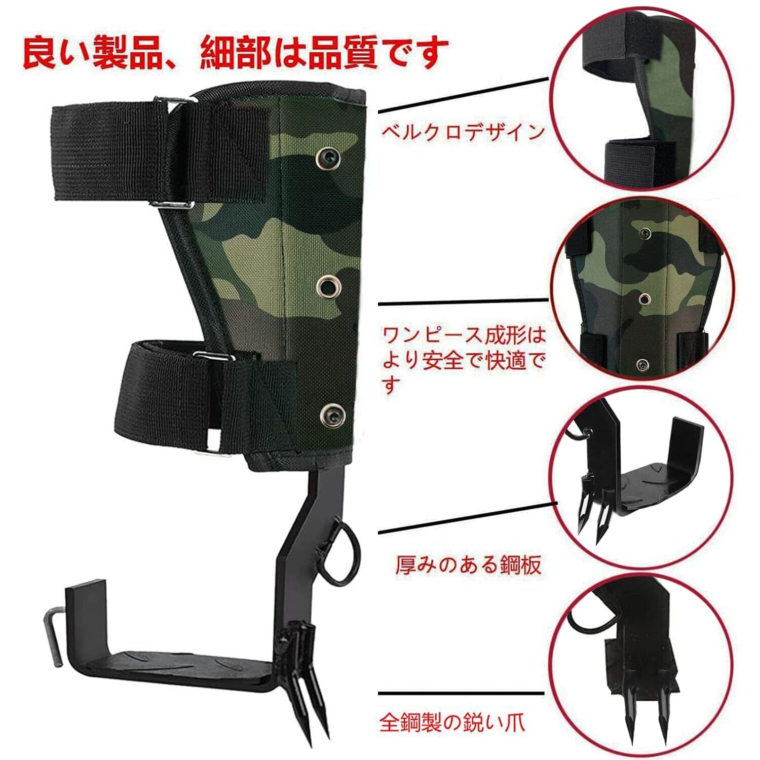 【製品の説明】:これは2024 年のアップグレード最新色:カモフラージュされたデザインのプロの木登りツールです、木登りキット、登山道具、プロの登山家 林業労働者 のために特別に設計されています。 寸法:高さ36CM、ペダル長さ10.5CM幅5CM、材質:鋼板、正味重量:約1.8KG、最大耐荷重:300KG(靴のサイズに関係なく)。 パッケージ内容:木登り道具1セット+ストラップ2本(ランダムカラー)+一対の手袋。注:製品は左右の足に分かれておらず、左右の足は共通です。