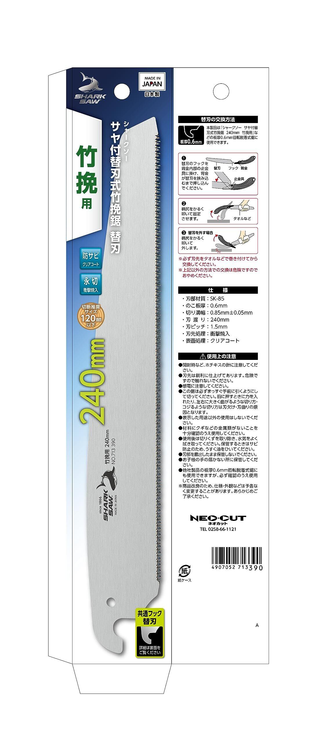 本製品は『シャークソー サヤ付替刃式竹挽鋸 240mm 竹挽用』などの板厚0.6mm回転脱着式鋸に使用できます。(共通フック替刃)