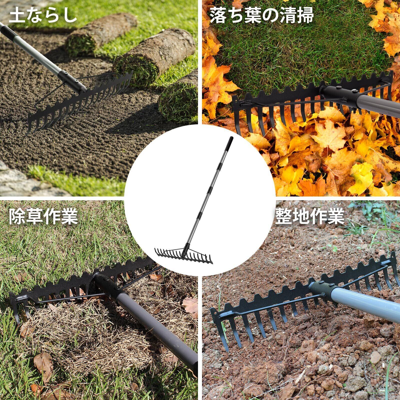 【多用途】:この調節可能なハンドルと幅広いヘッドの弓型レーキは、ガーデニング、庭の仕事、芝生の管理に最適なガーデンツールです。固い土を緩めたり、マルチまたは他の材料を広げたり、植える前にエリアを平らにするのに最適です。このレーキを使って土を平らにしたり、土の塊を崩したり、表土、堆肥、砂、砂利を広げることができます。このレーキはまた、刈り取った草のかき集め、葉の集め、雑草の引き抜き、その他の軽いゴミの処理にも適しています。