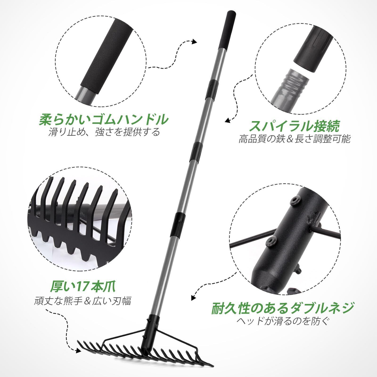 【17本の歯のレーキヘッド】:17本の歯のデザインにより、ガーデン弓型レーキは様々な種類の土に簡単に突き刺さり、土を効率的に緩めるなどのガーデニング作業に役立ちます。6.3cmの長いレーキ歯と17インチの幅広レーキヘッドは、より正確なレベリング、広範囲のカバレッジ、植物の根を傷つけることなくより深い土壌深度を実現します。ヘッドの厚さは3mmで、歯の折れや破損を経験することはありません。ネジを締めると非常に頑丈で、耙いている間にバラバラになったり落ちたりしません。