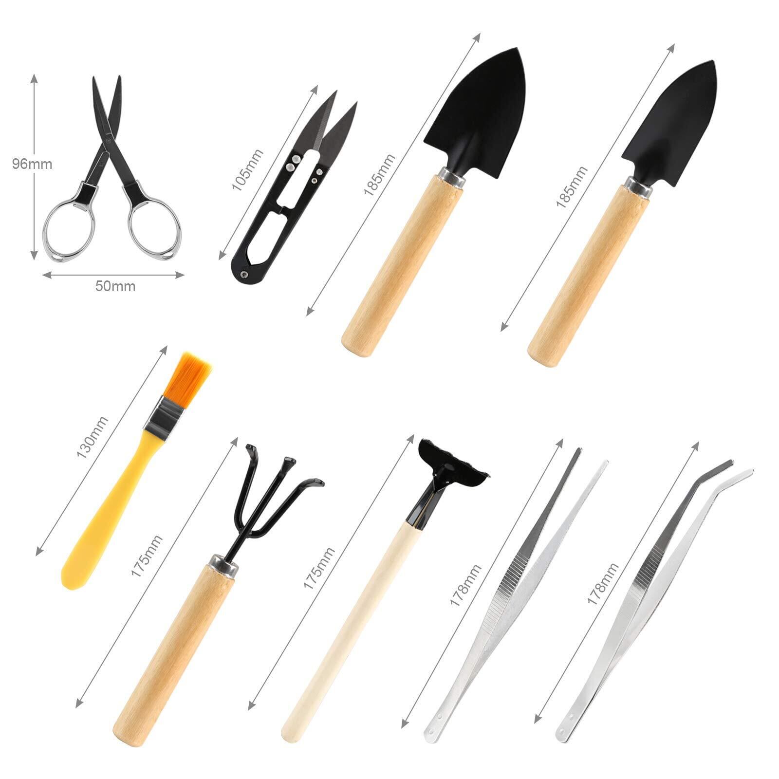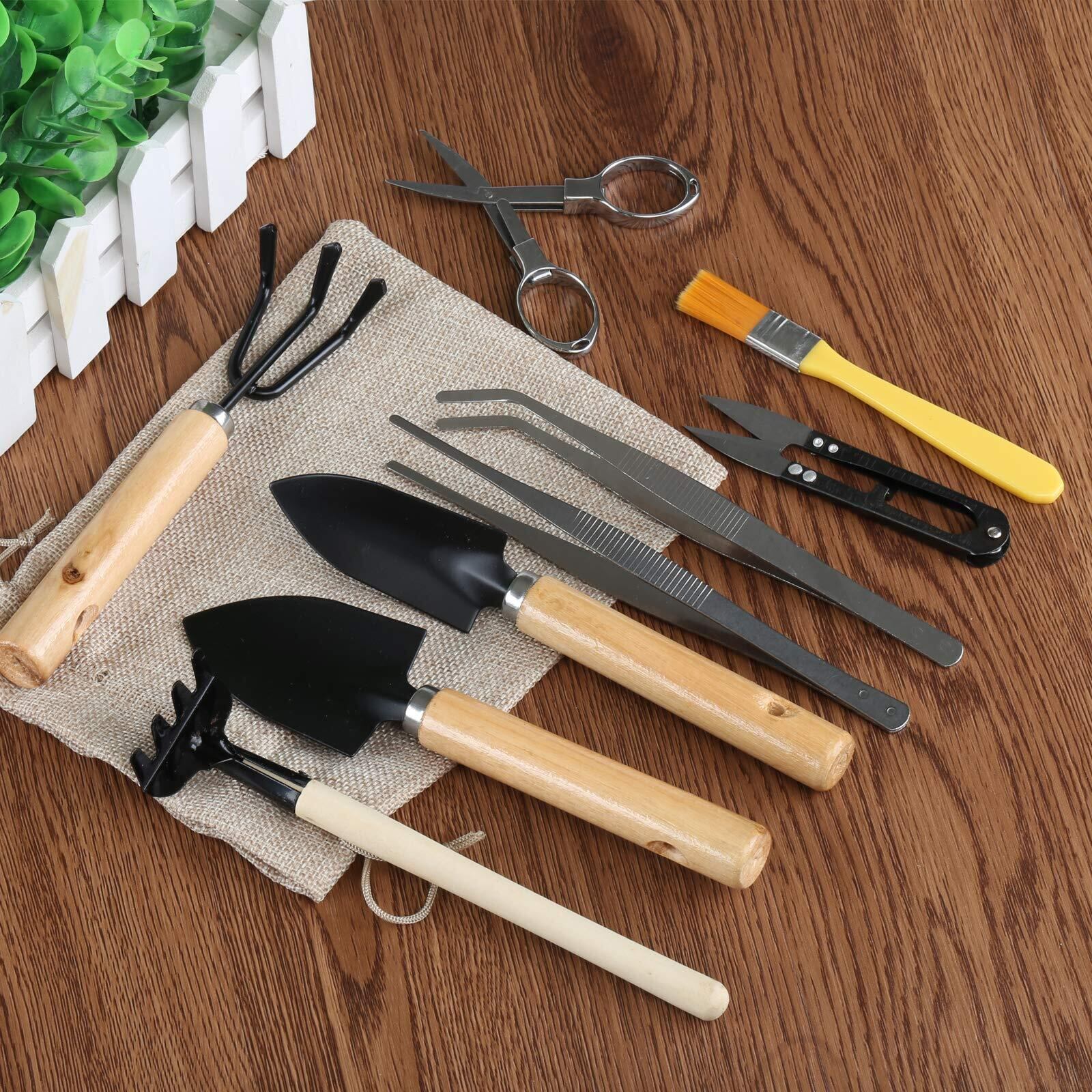 セット内容:ゴミ払い用化粧筆×1個 移植スコップ×1個 移植ごて×1個 ミニ熊手(土ならしレーキ)×2個 ハサミ×2個 ピンセット×2個 収納袋×1個