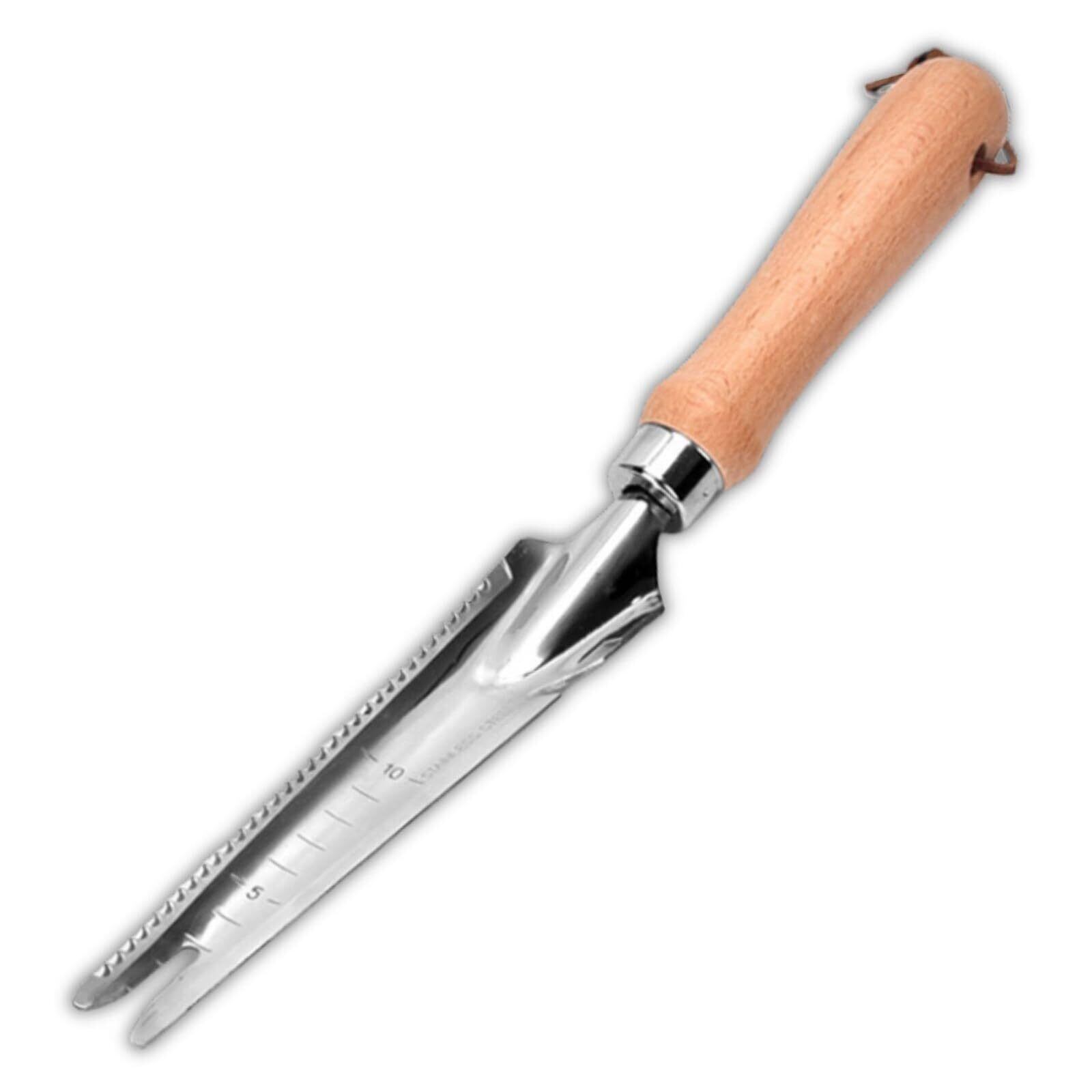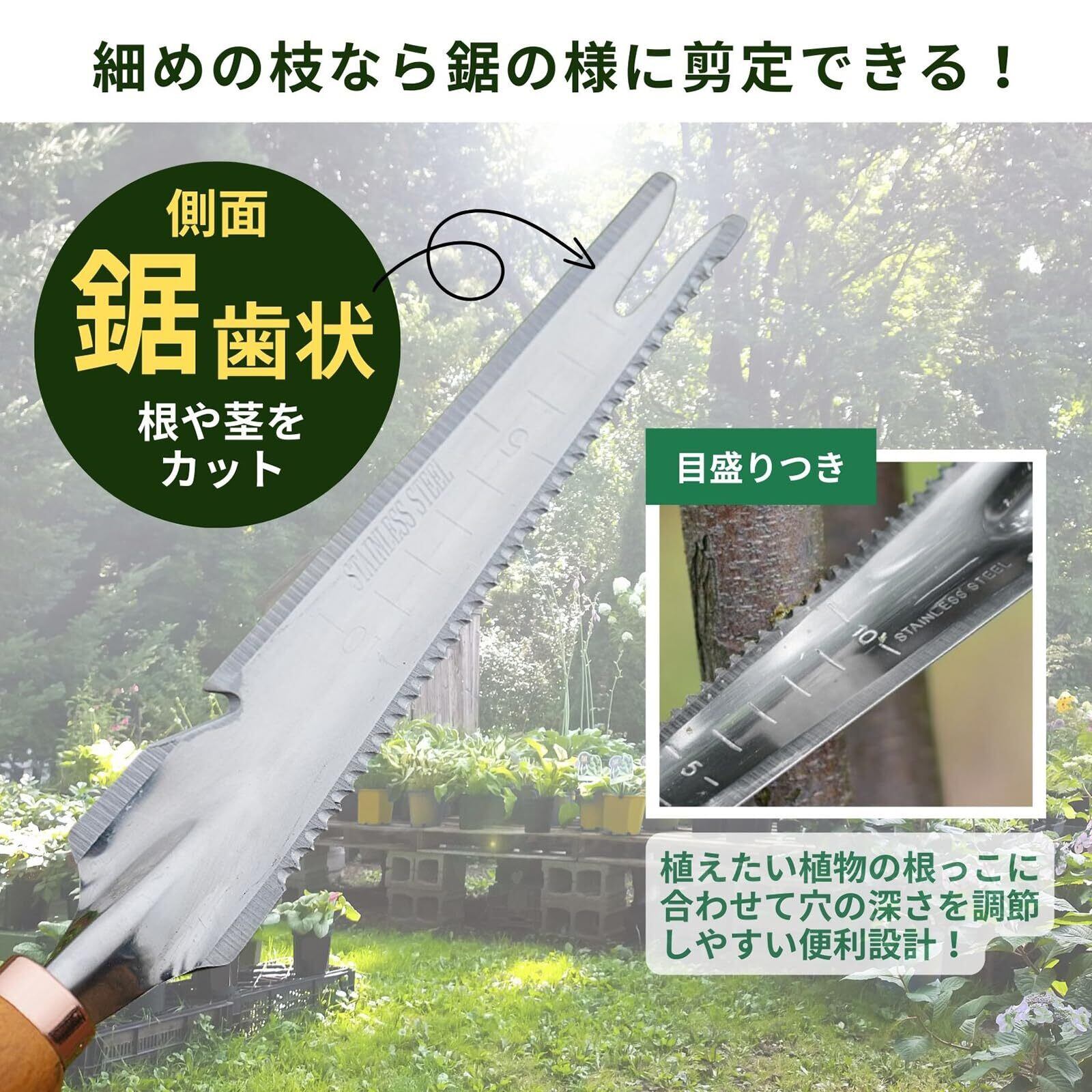 側面は鋸歯状になっており、根や茎をカット可能。細めの枝であればノコギリのように動かすことで切り落とすこともできます。目盛り付きで、植えたい植物の根っこに合わせて穴の深さを調節しやすい便利設計。
