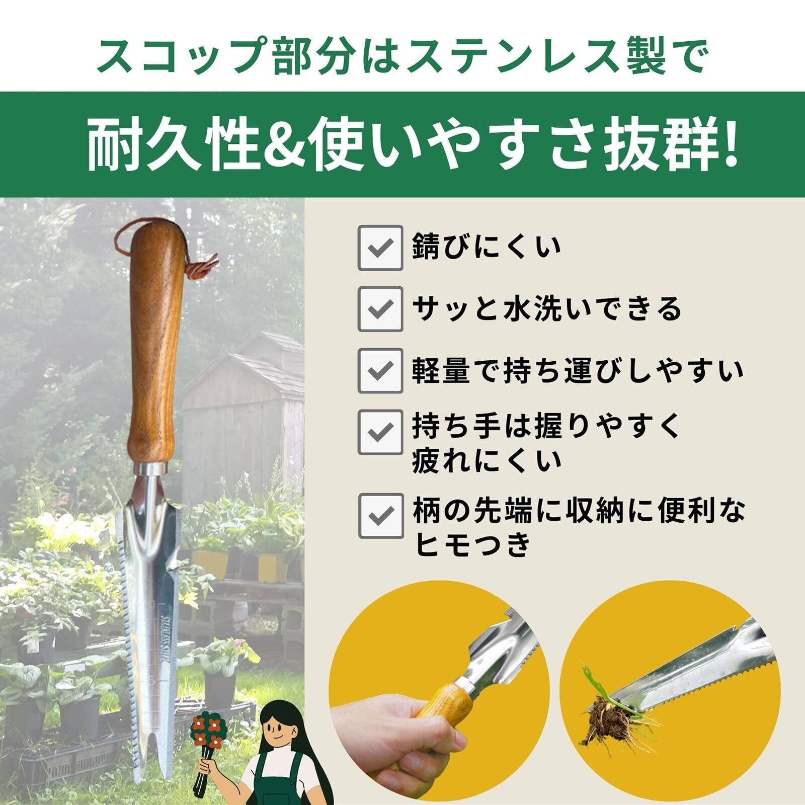 スコップ部分はステンレス製で耐久性に優れていて錆びにくく、汚れてもさっと水洗いできます。軽量で、持ち手は手にフィットする形状なので、長時間の作業でも疲れにくく手も痛くなりにくい。柄の先端には収納に便利な紐付き。