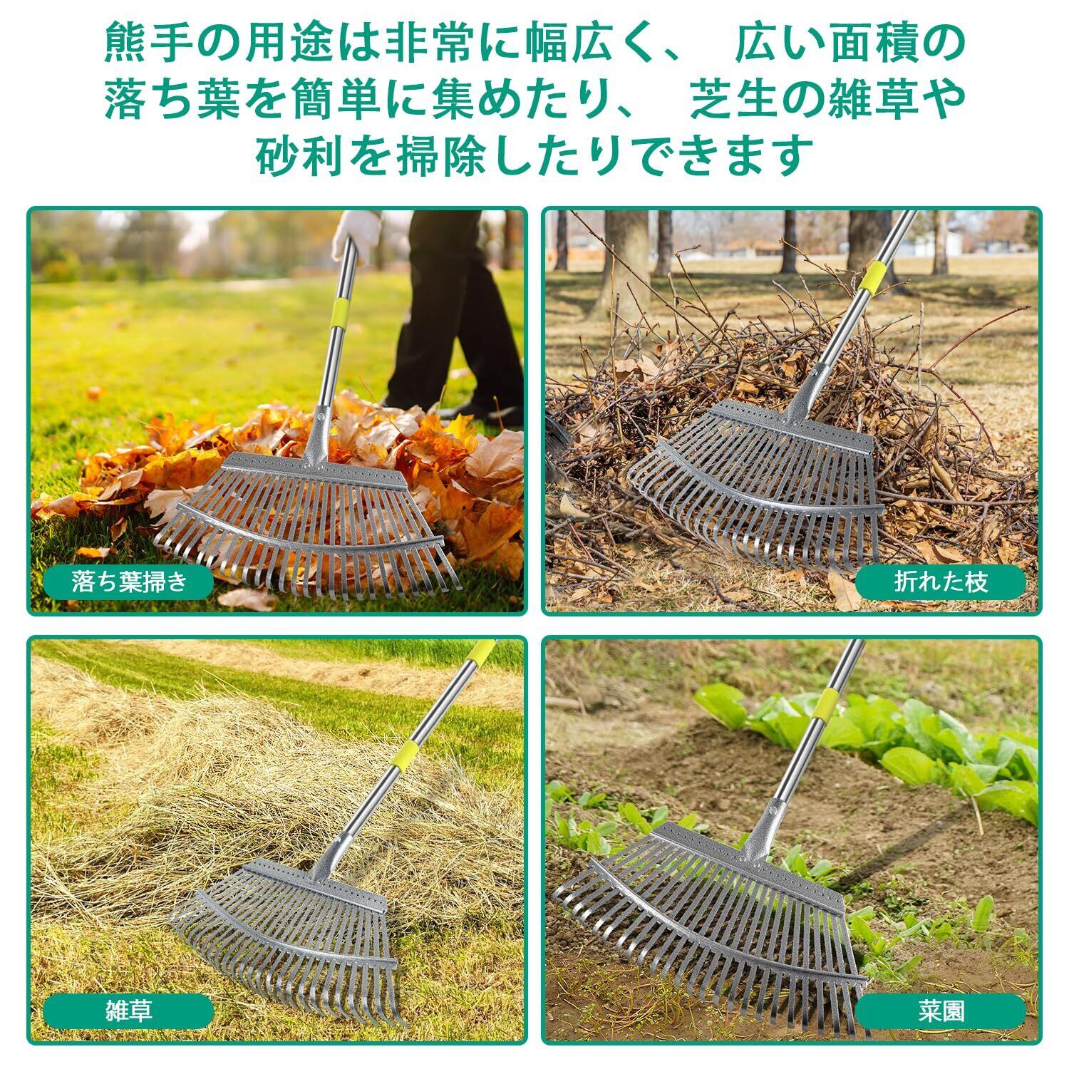 【25爪のレーキ】熊手レーキは高品質のステンレス製で、変形、断裂しにくい、防錆性と耐久性が優れ、は保護層でコーティングされており、耐久性があり、腐食や錆びが発生しにくい、長くご利用頂けます。植物の根を傷めにくい平帯状のすくい歯で、芝生や庭での作業時に、歯の脱落、損傷、断裂、腐食などの問題が発生しません。