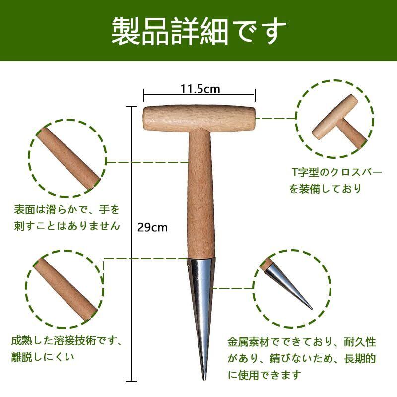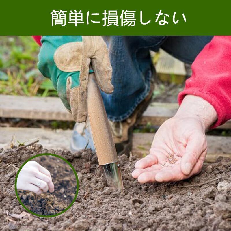 耐久性のある素材:穴掘り器、1個。 サイズ:長さ29cm 幅11.5cm 重さ115g 耐久性のある素材:ヘッドは高品質のステンレス鋼で作られ、耐久性があり、錆びない、スケールのデザインで、明確に深さを知っている、ハンドル部分は木で作られ、滑らかで、過酷ではない、人間工学に基づいたデザインで、持ちやすく、回しやすい、手と腕の圧力と疲労を大幅に軽減することができ、より簡単に土壌に、長時間使用することができます。 使用方法:本製品を土に入れたり、苗を挿したり、土をほぐしたりするだけで、植物が適切な深さに植えられていることを確認し、成長させることができます 片手操作、それはまた、球根や種子を植える時間を節約することができ、植栽定規として使用することができ、それは非常に便利で、片手で操作することができます。 用途:屋内盆栽、バルコニー、パティオ、野菜畑、小さな庭、前庭の園芸用具などに適しており、園芸作業を容易にします。