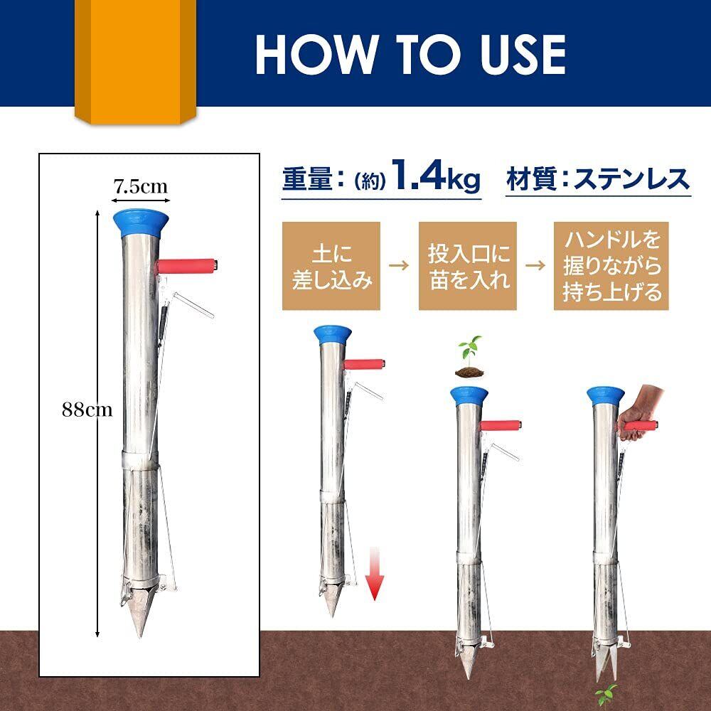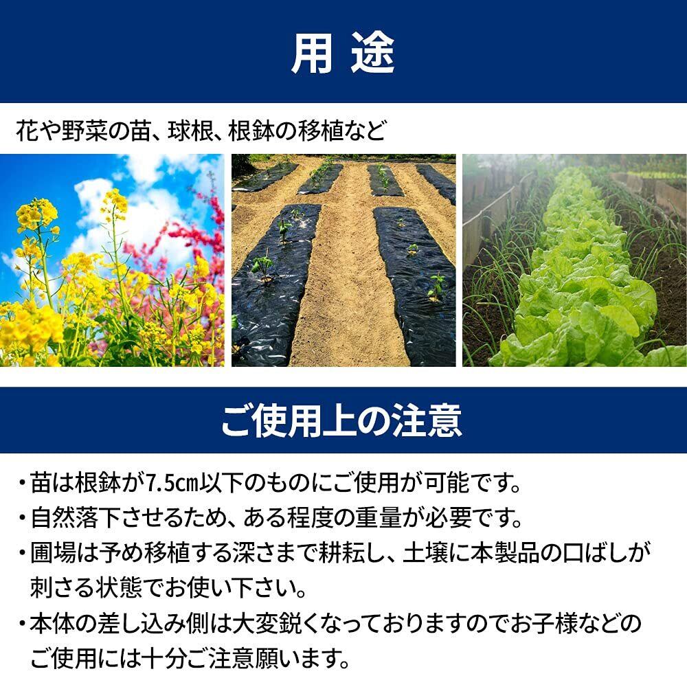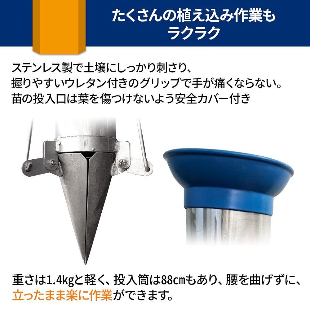 【主な特長】筒の内径は直径7.5cmで、様々な土付き苗に対応できます。重さは1.4kgと軽く、投入筒は88cmもあり腰を曲げずに、立ち作業で楽々行えます。苗の投入口は葉を傷つけないよう安全カバー付きです。