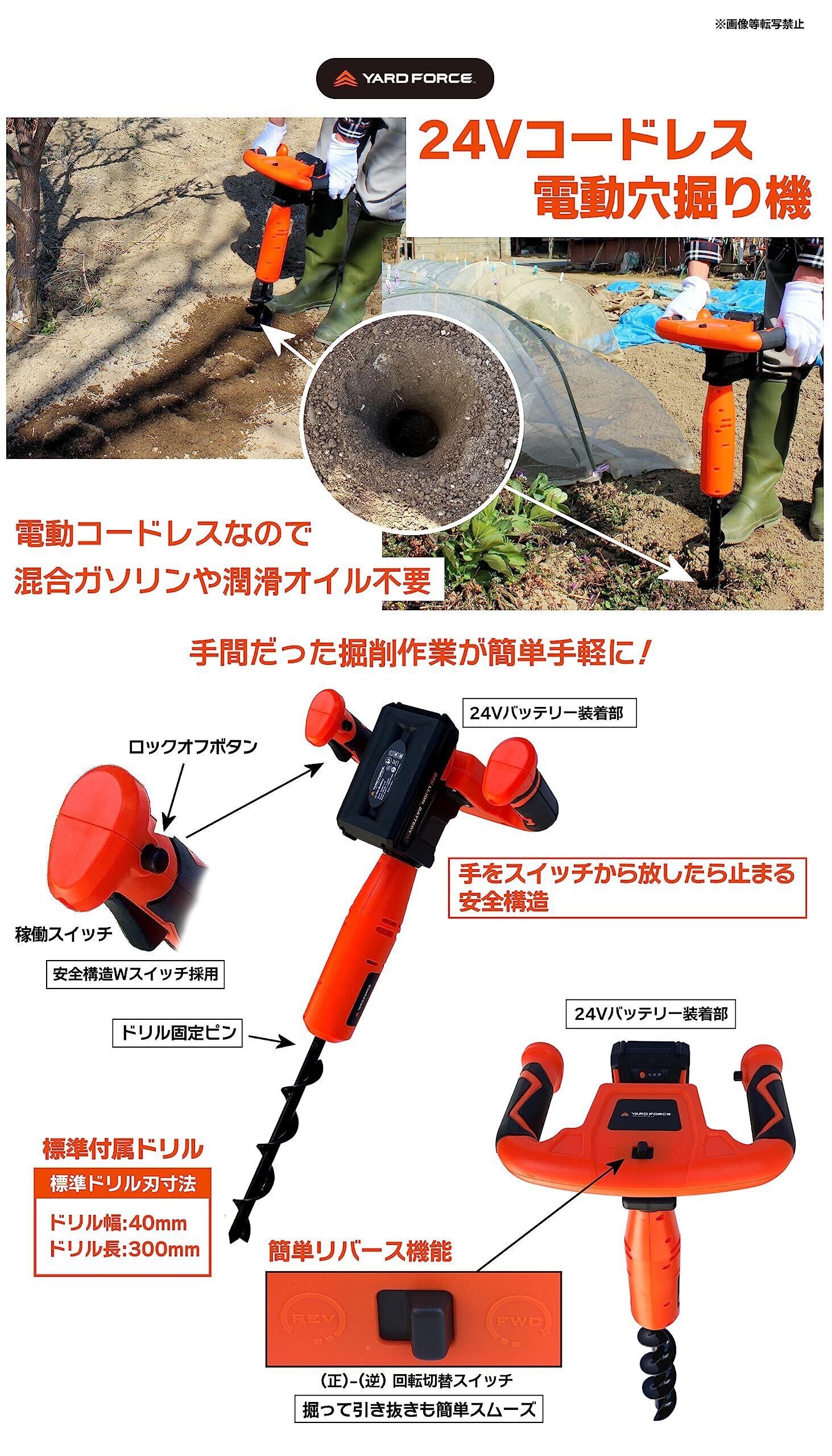 そんな面倒で大変な作業が、力いらずで女性でも簡単に穴掘りが出来る「YARDFORCE 24Vコードレス穴掘り機」が登場!