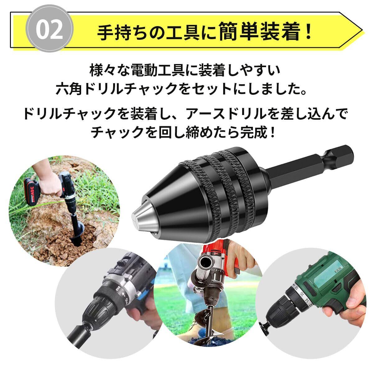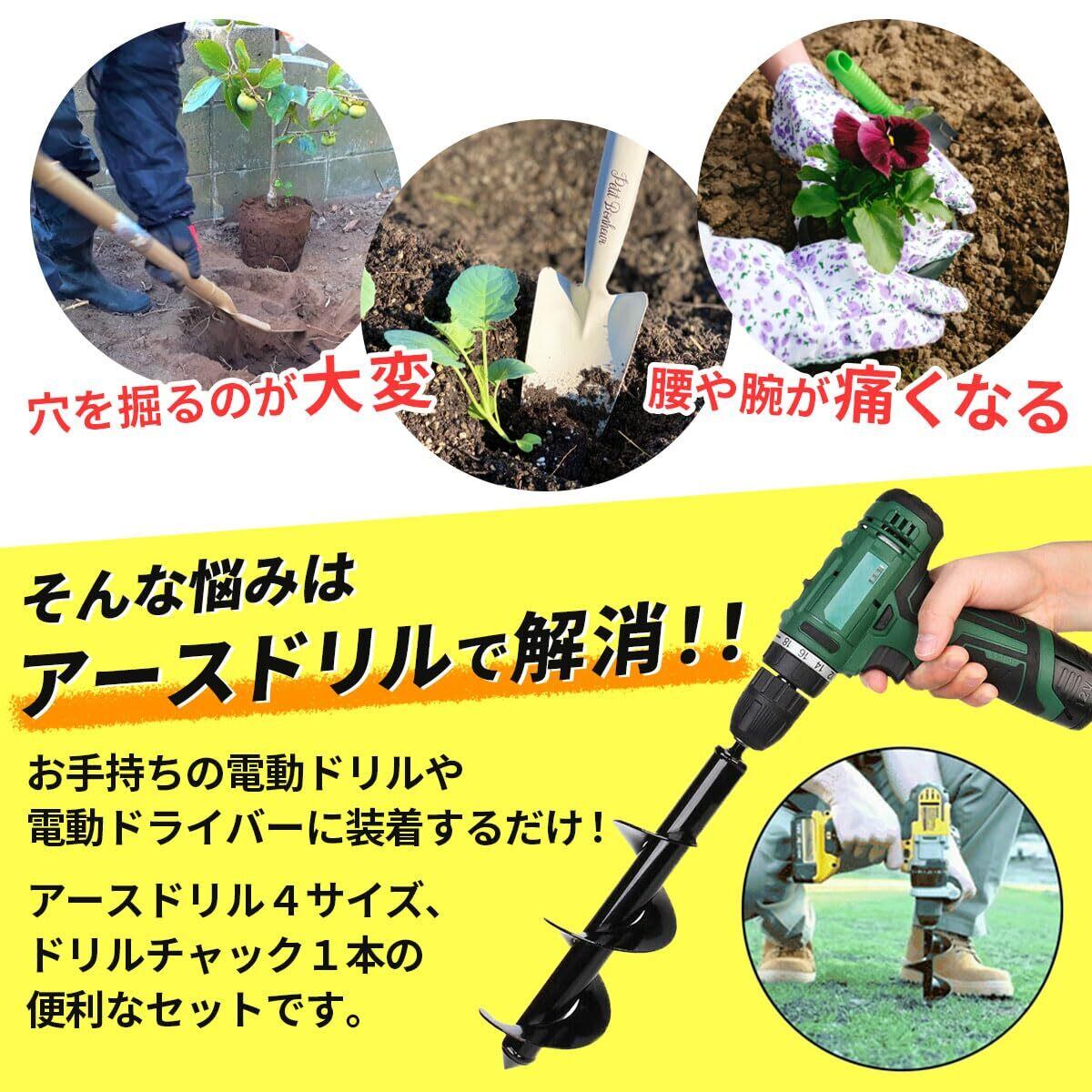 アースドリル、ドリルチャックセットは、電動工具と併用でサイズ合わせ簡単!農業、園芸、ガーデニング、硬い土堀作業時間を短縮、作業負担を軽減!汎用性の高い直径、4、5 8センチの ドリル4本、ドリルチャック1本セット。