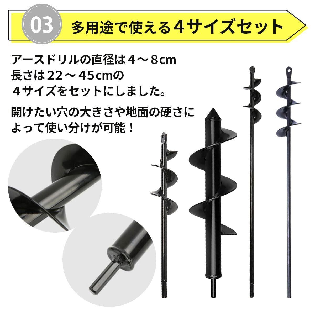 アースドリルは汎用性、使用頻度の高い人気サイズの4本セット。穴あけ、支柱、苗床、杭打ち、田畑、植林、造園。シャベルや鍬で穴を拡げるのも簡単。農作業、レジャー、釣り、イベント、テント、アウトドア、DIY用途も豊富。