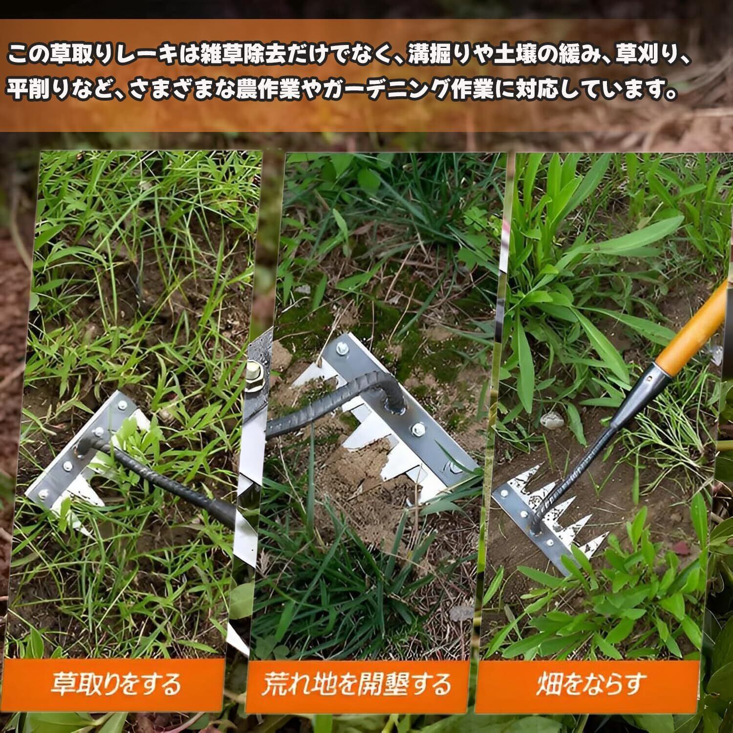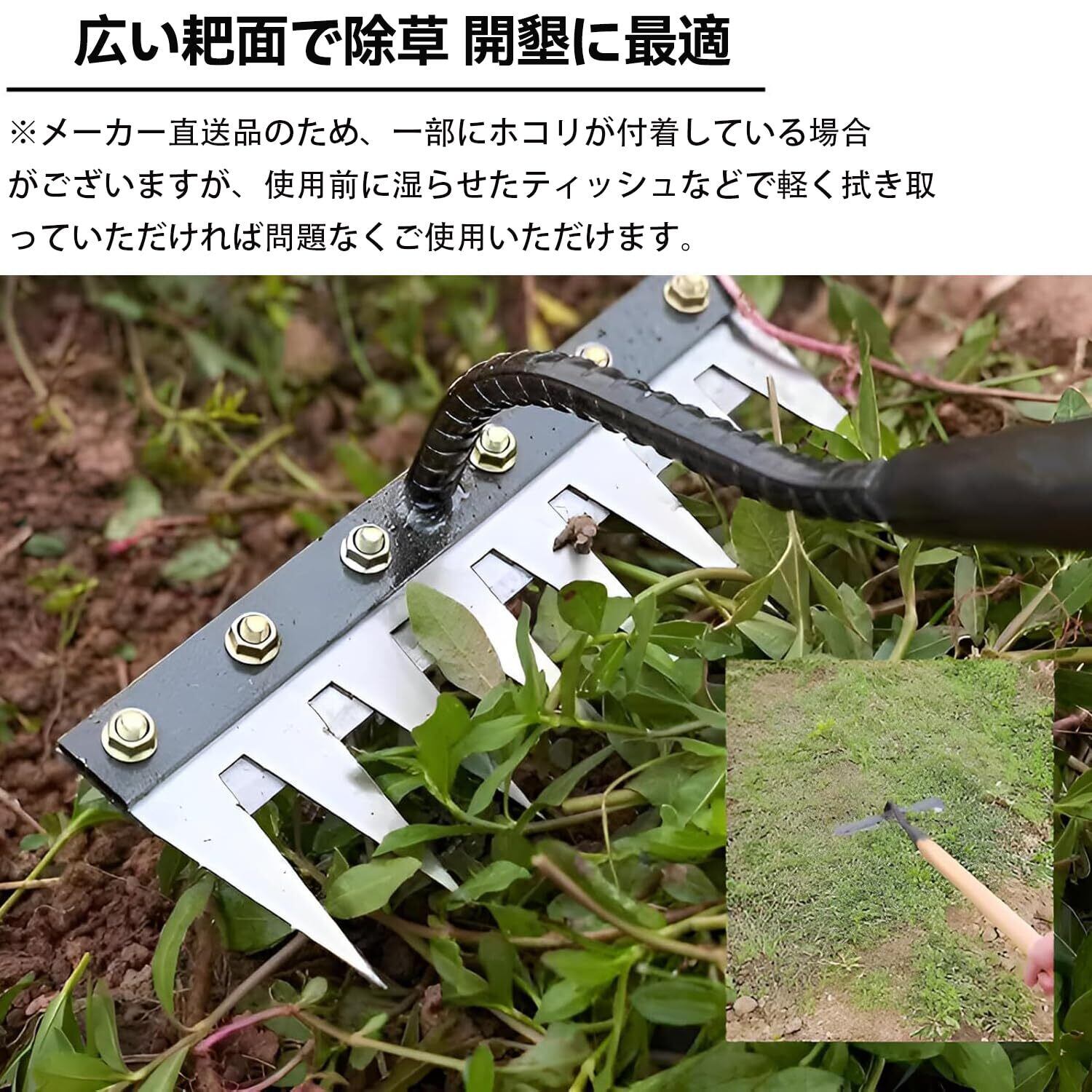 【多機能で実用的なガーデニングツール】 この草取りレーキは、雑草の除去はもちろん、溝掘りや土壌の緩み、草刈り、平削りなど、さまざまな農作業やガーデニング作業に幅広く対応できる多機能ツールです。使用前には各部品が正しく取り付けられていることをご確認のうえ、周囲の安全を確保してからご使用ください。また、お子様の手の届かない場所で保管し、水や湿気の多い環境での長時間の放置はお避けください。商品の一部パーツには、製造・保管・輸送の過程で生じる細かな汚れが見られる場合がありますが、ご使用前に柔らかい布などで軽く拭いていただくと、快適にご使用いただけます。