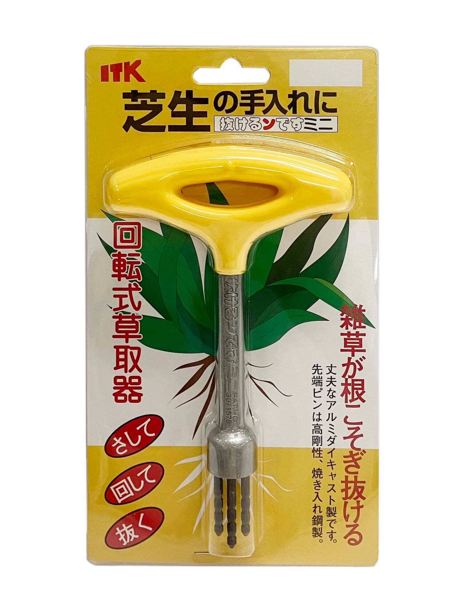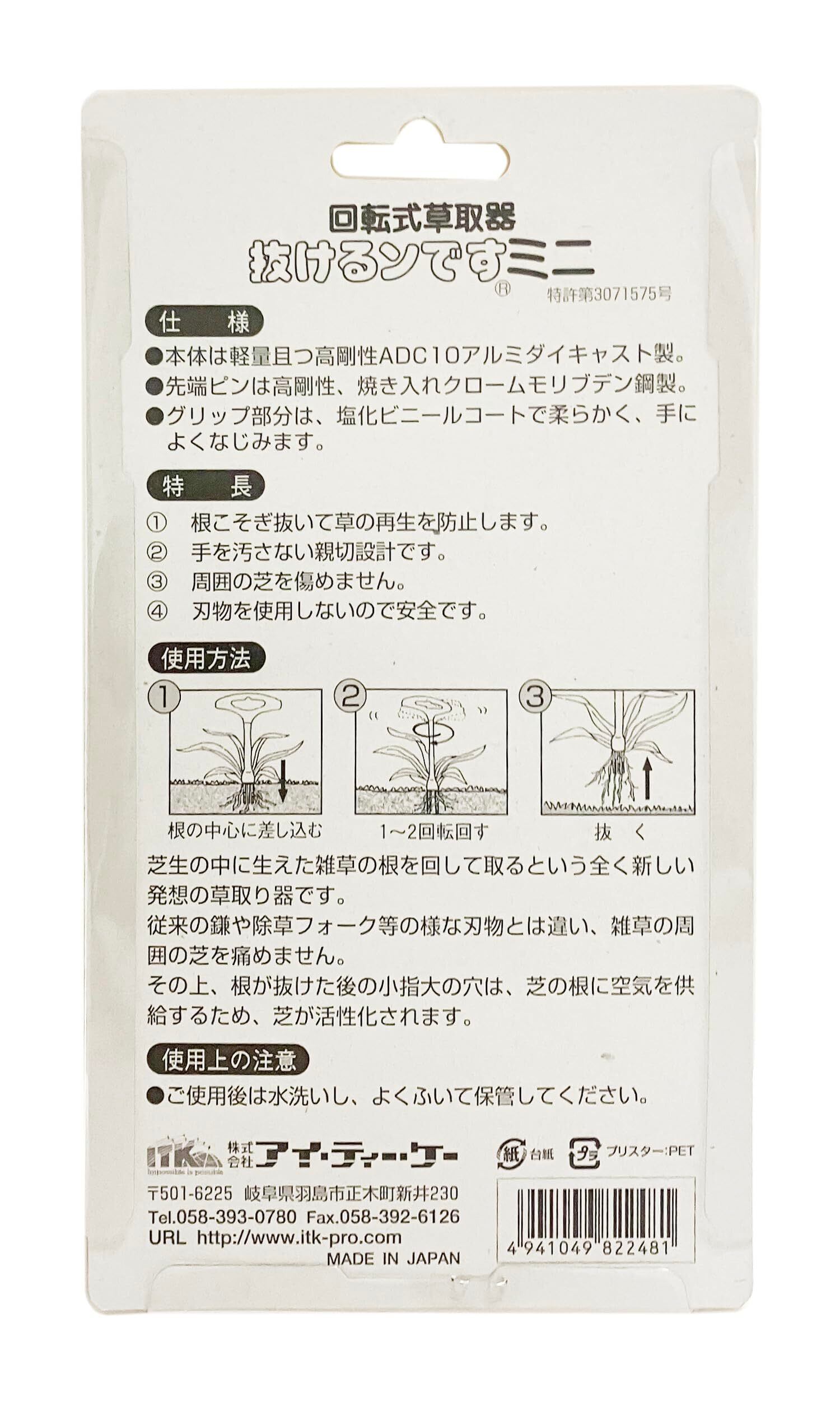 片手で操作できる、便利な雑草抜きです。雑草の真上から深く差し込んでぐるりと回し、根を引き抜きます。根の深い雑草も一度で抜くことができます。芝生の間に生えた雑草など、周囲の土を崩さず抜くのに最適です。抜いたときにできる穴は直径約1cm位です。サイズ(約):長さ15cm素材:ピンは焼入クロームモリブデン鋼、グリップPVCコーティング、本体ADC10アルミダイキャスト製重量(約):92g日本製■この商品はヤマトコンパクトにてお届けのため、以下の地域については、下記サービスについてはお受けできません。(北海道、東北、中国、四国、九州、沖縄届けの場合)・代金引換決済