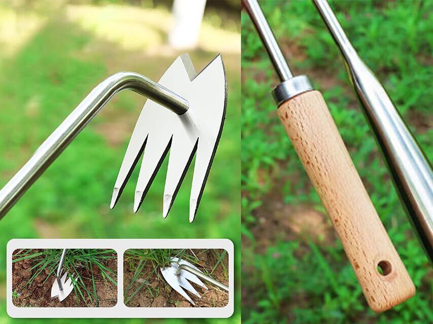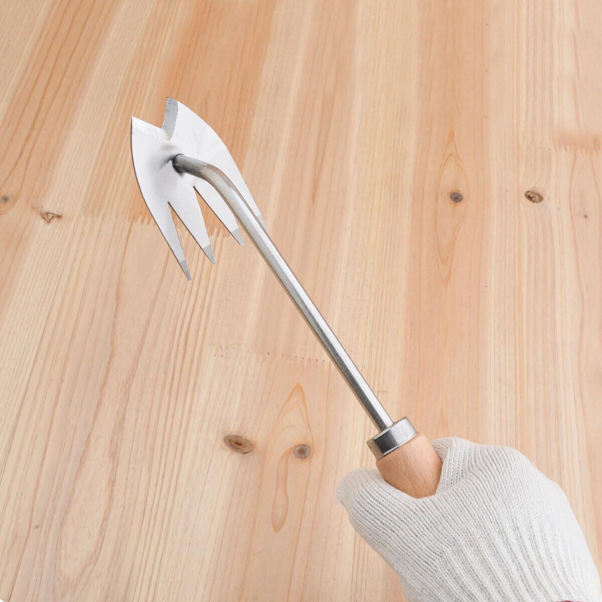 使い方:釘抜きの原理で強力除草。使い方は簡単で、雑草を取り除くには、四本の歯を土に差し込み、根が溝の底にできるだけ近づくようにする。 根っこから抜けるので草抜きが楽になります。小さい雑草には土をかじく様に使うと便利です。四本の歯を配したデザイン、刃がフォーク状になっていて、土中を掘り起こすと刃が細かい根や葉に絡んで、余計な力を入れずに簡単に抜けます。