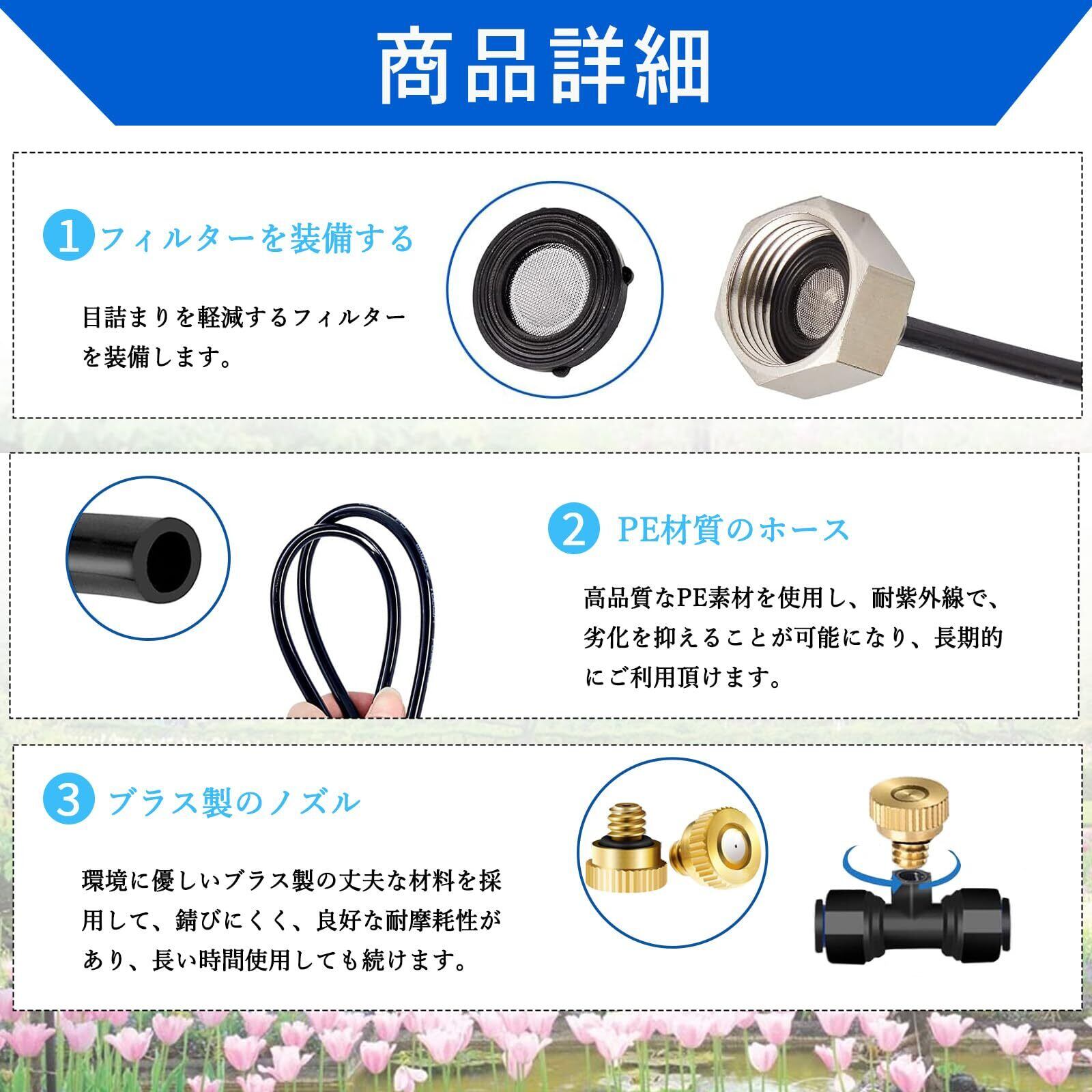 【様々な用途に】植物灌漑、野菜庭、芝生ミスト、冷却システム、冷却システム、塵の除去、ミストシャワー、ガーデン加湿できます。また、扇風機と併用すると小型の加湿器になります!花壇、菜園のような手の届きにくいところにも一度に水やりできます。緑化管理はより便利で省時間・省労力です。