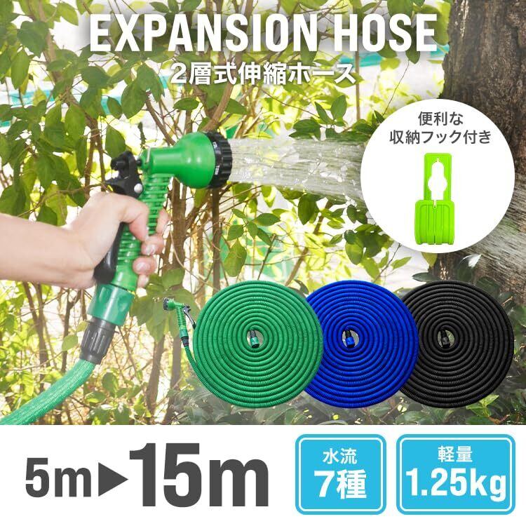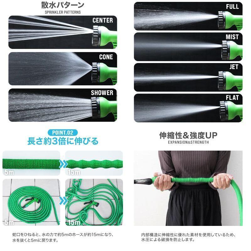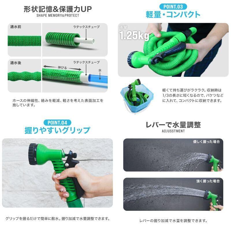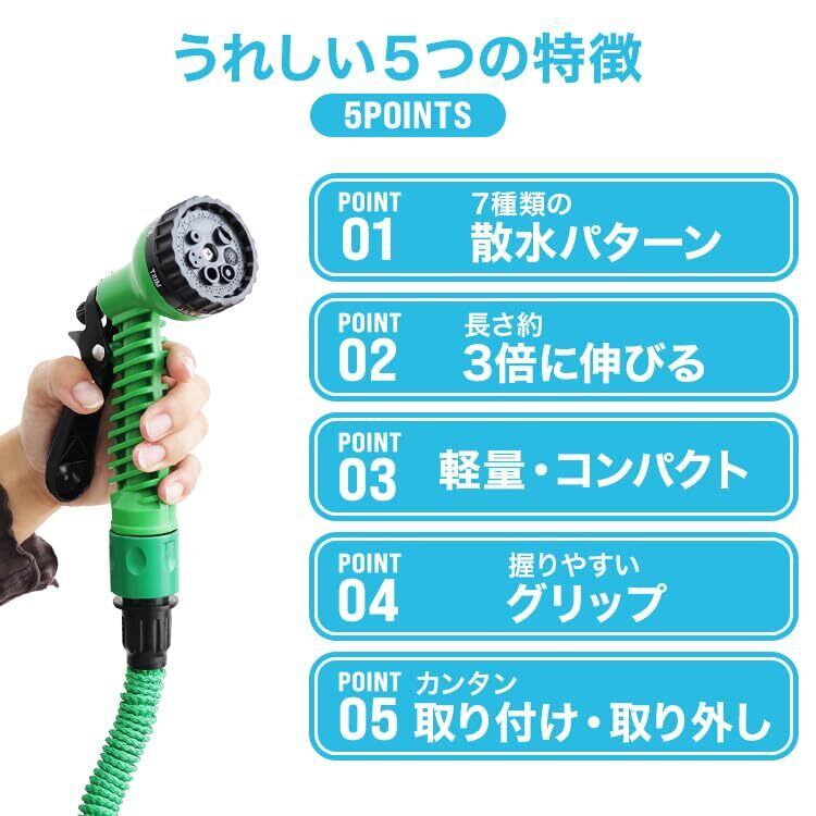 ウェイモール 伸びるホース 15m 散水ホース 3倍に伸びる 5m→15m 7パターン散水ノズル 軽量 耐久性 丈夫 コンパクト ジョイント・ノズル付き ガーデニング 園芸 ベランダ 庭掃除 洗車(グリーン) | KSショップ
