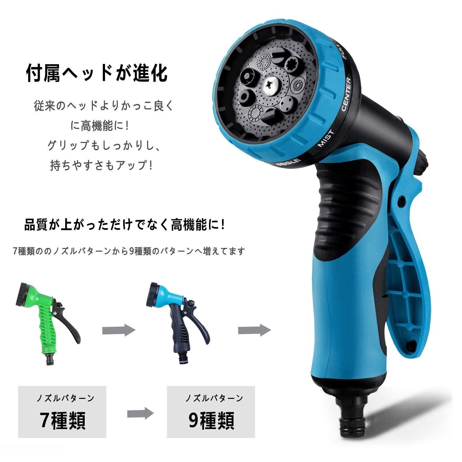 【付属ヘッドが大幅進化】 従来のヘッドよりよりかっこ良くに高機能に!従来の7種類のノズルパターンから 9種類のパターンへ水やり、洗車など様々な場合に合わせてご使用いただけます。また、ストッパーを利用して、水を出しっぱなしにすることができ、時間も力も節約できます。