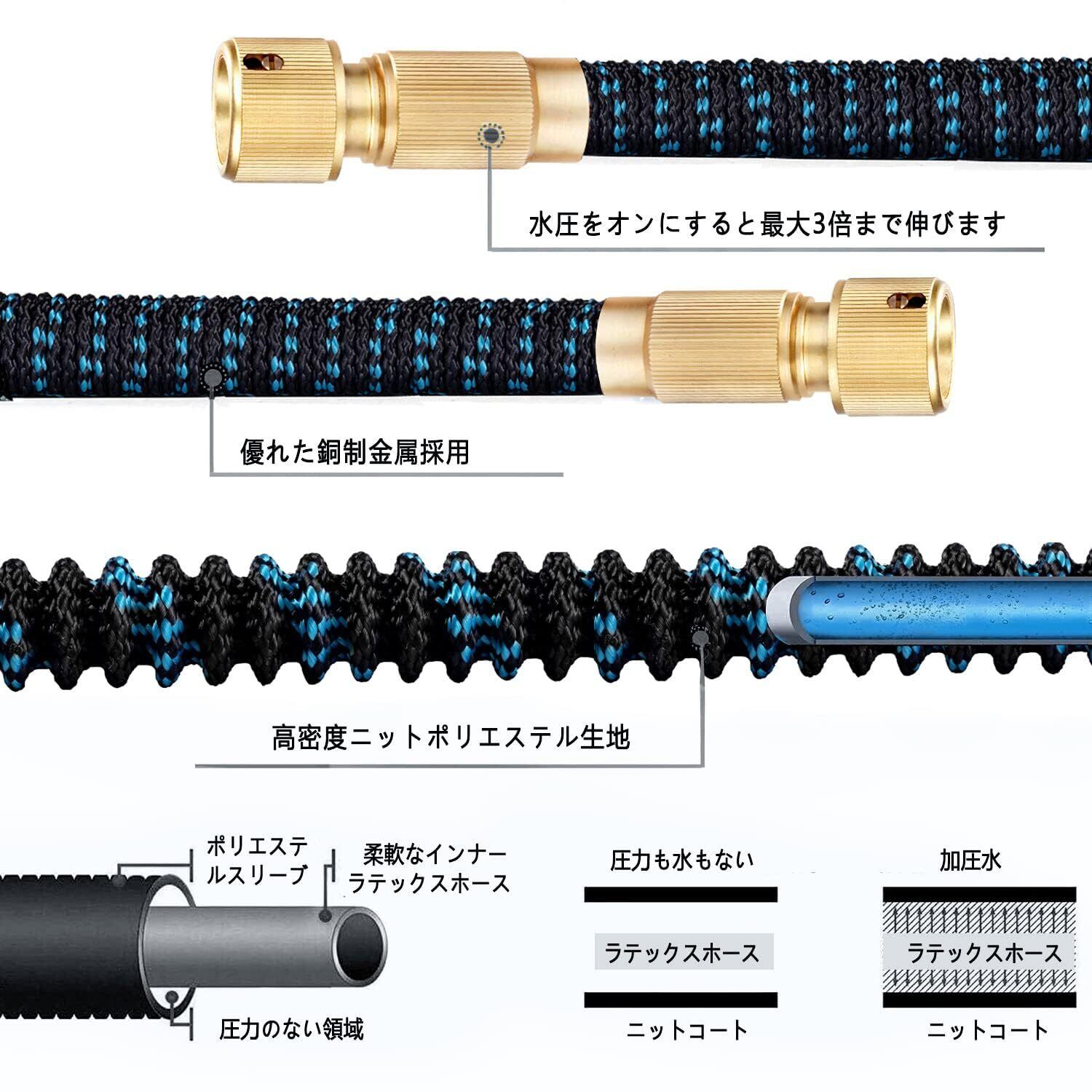 【ホースの伸縮性抜群】:ホースが通水後、3倍まで伸びることができます。内層はラテックスなので、伸縮性のほかに柔軟性もあり、折れることや絡まることはご心配なく、安心してご移動ください。